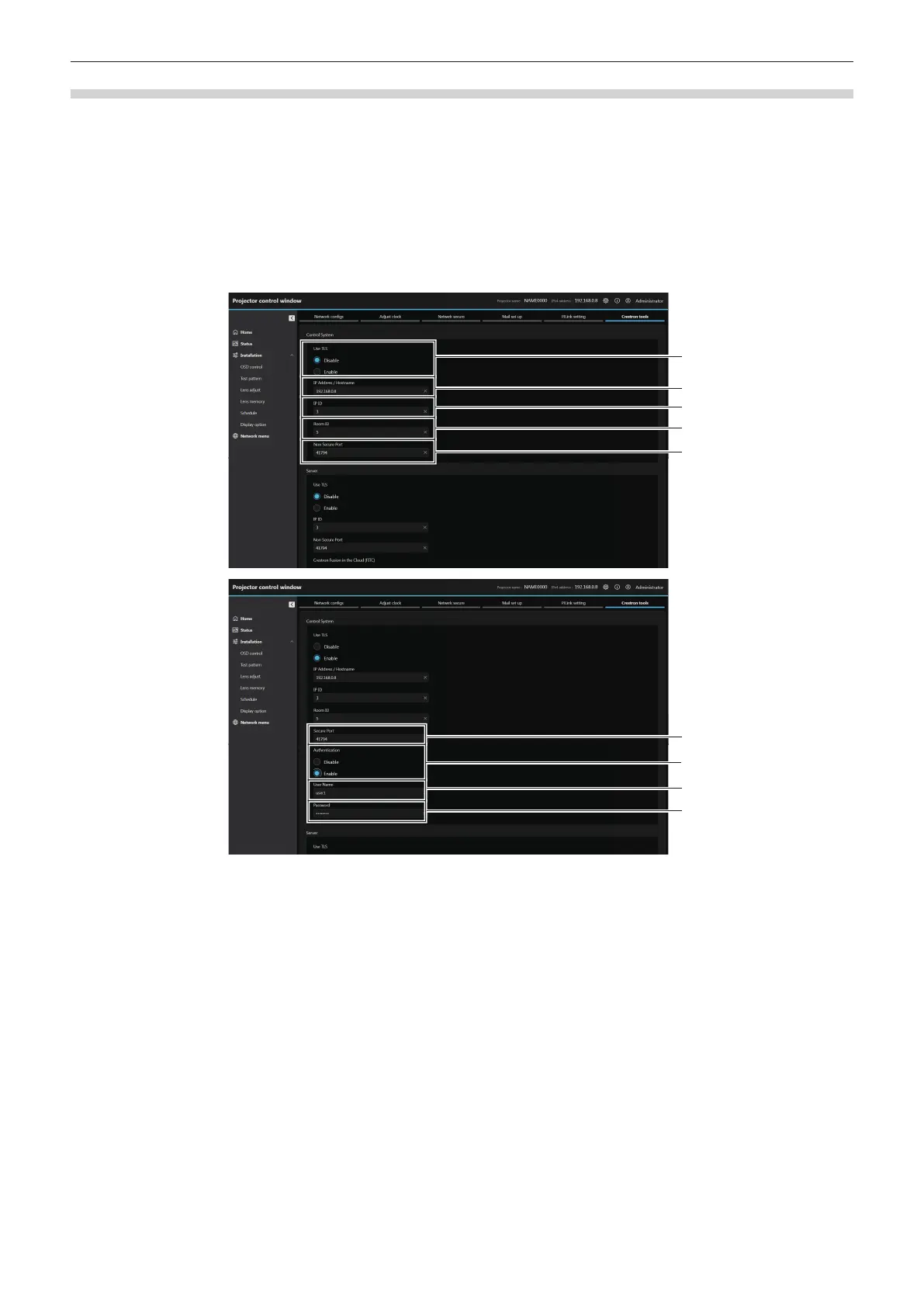 Set the information required for connecting the control system of Crestron Electronics, Inc. to the projector, and
