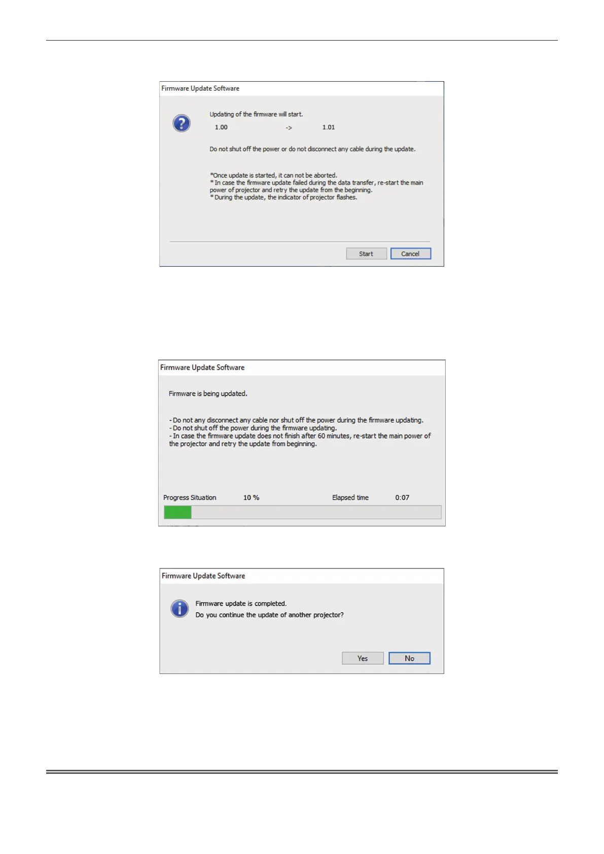 f To continue to update the rmware of another projector, click [Yes]. The connection setting screen in Step