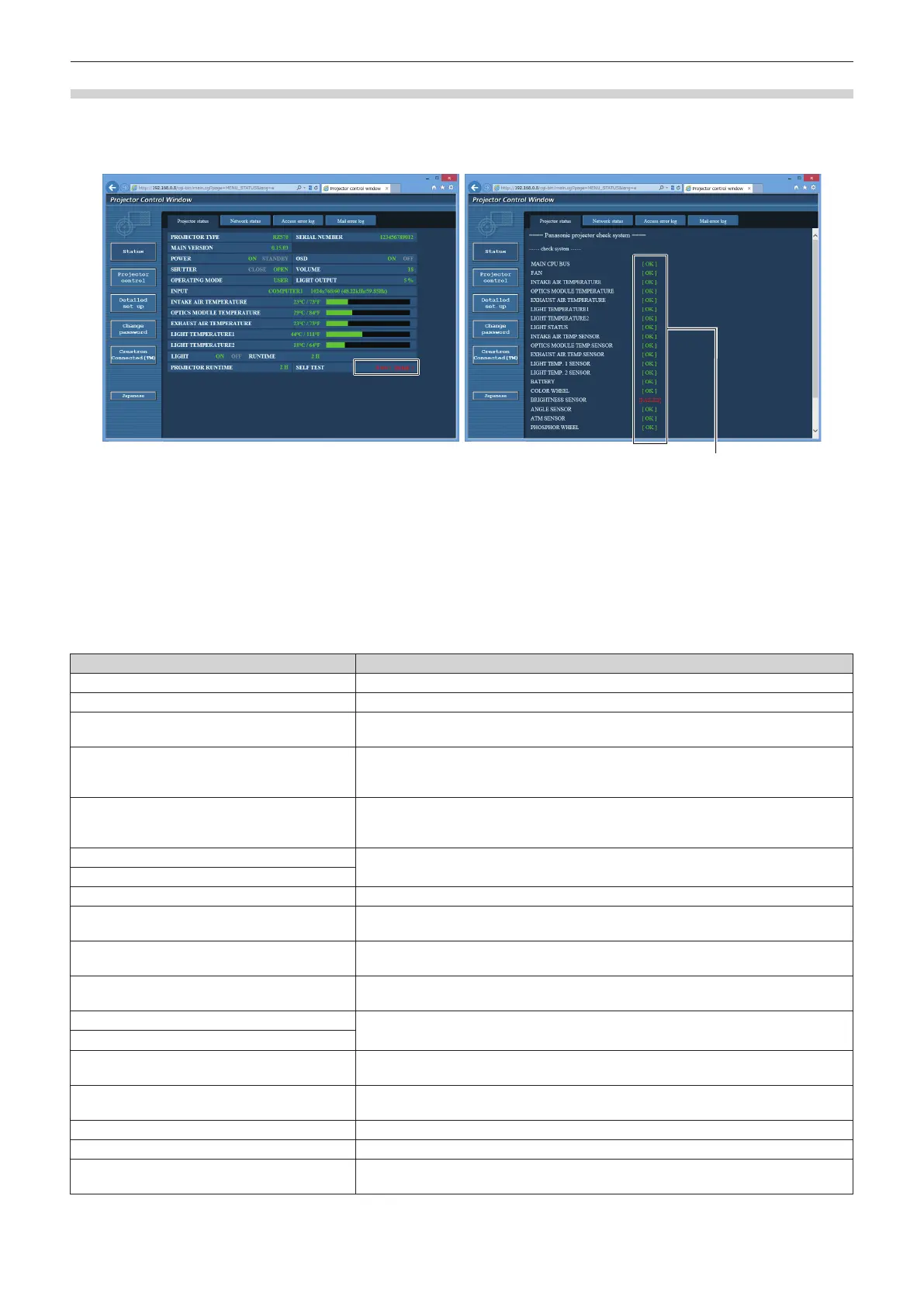 When [Error (Detail)] or [Warning (Detail)] is displayed in the [SELF TEST] display eld of the [Projector status]