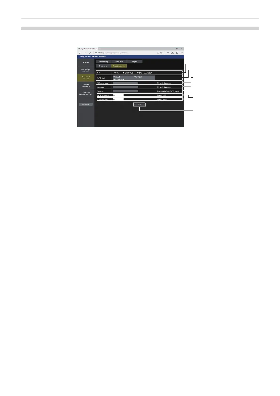 Set the authentication items when POP authentication or SMTP authentication is necessary to send an E-mail.