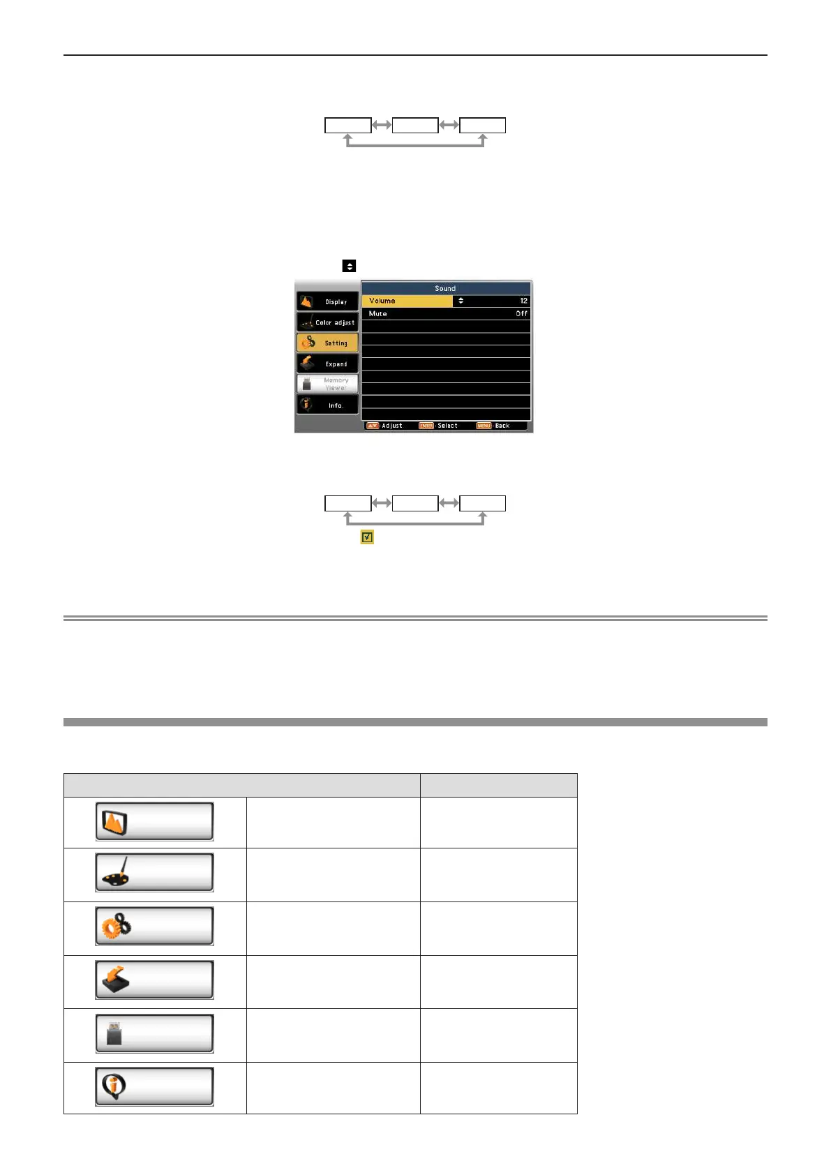 f For menu items, refer to “Main menu” (x page 45) and “Sub-menu” (x page 46).