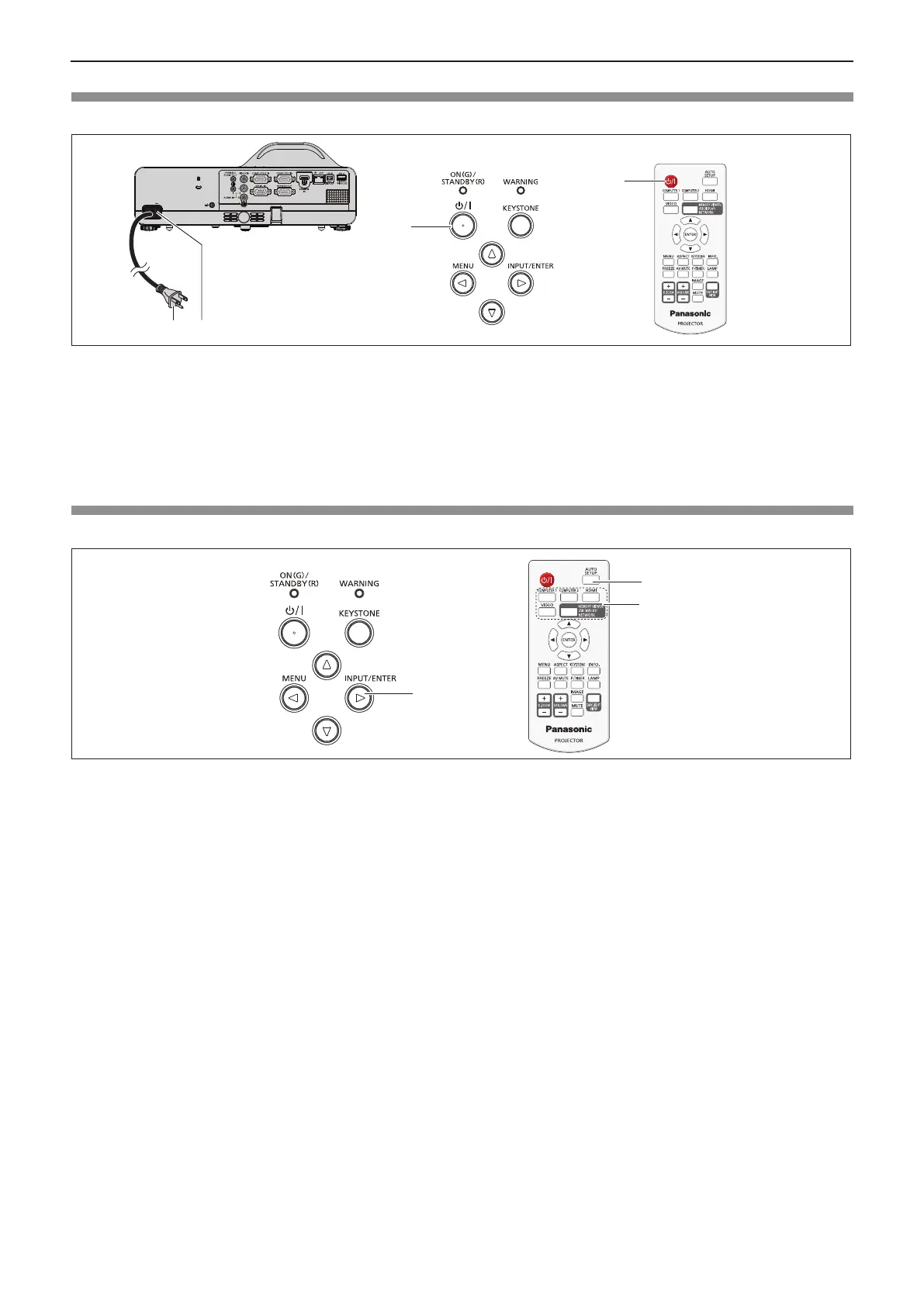 f The power indicator <ON(G)/STANDBY(R)> lights in green and the image is soon projected on the screen.