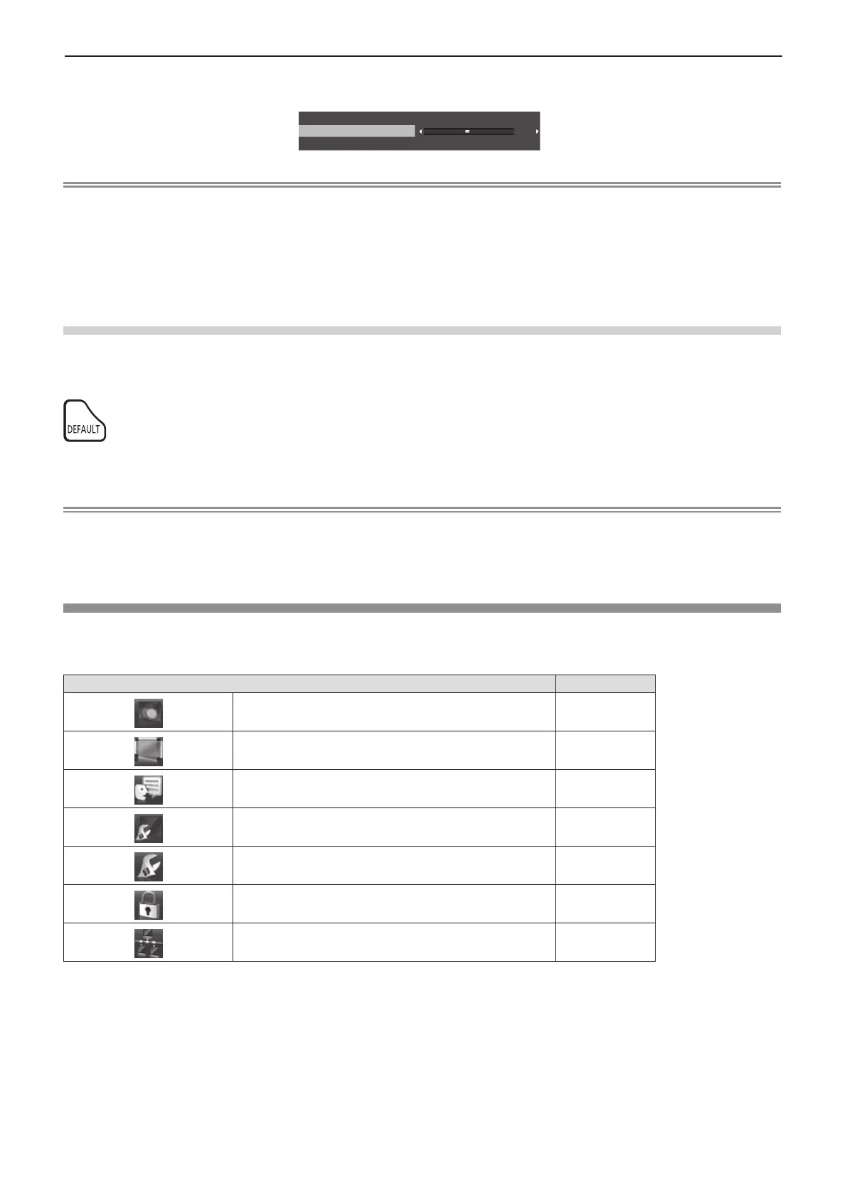 f Some items cannot be reset by pressing the <DEFAULT> button on the remote control. Adjust these items individually.