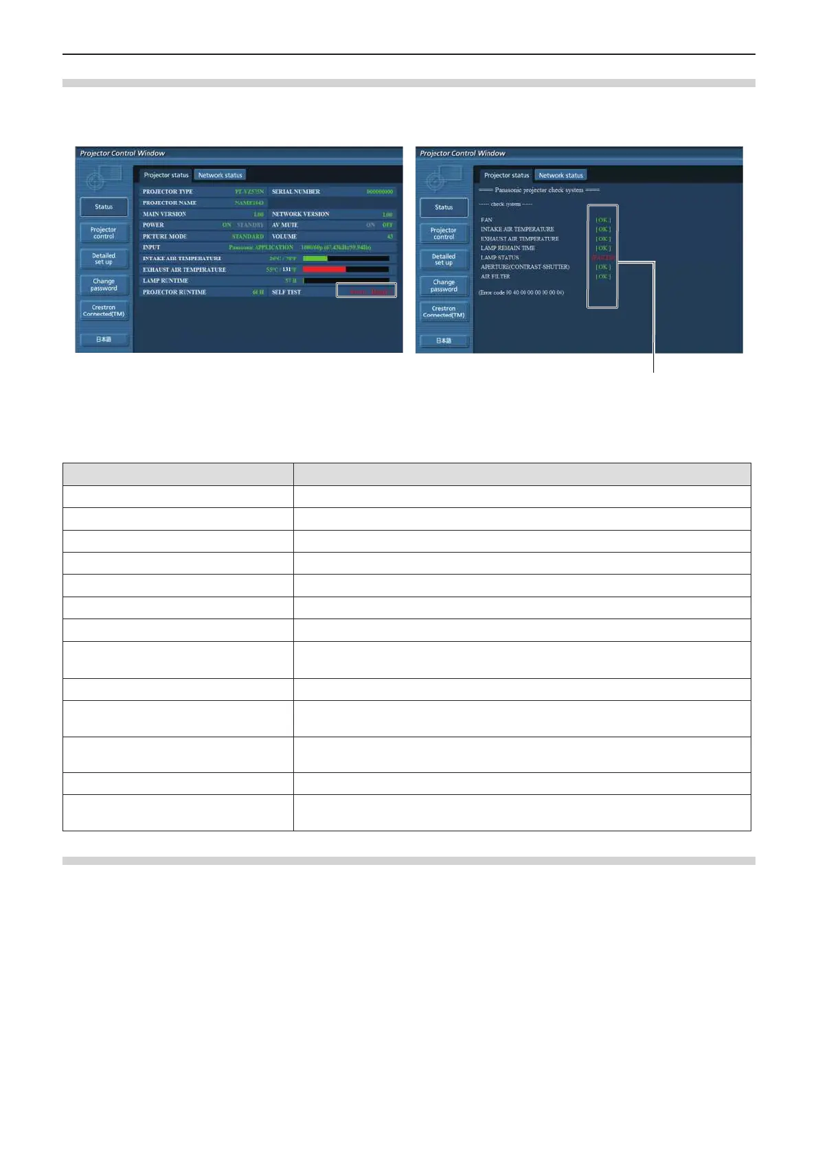 When [Error (Detail)] or [Warning (Detail)] is displayed in the self-diagnosis display of the [Projector status] screen, click it to