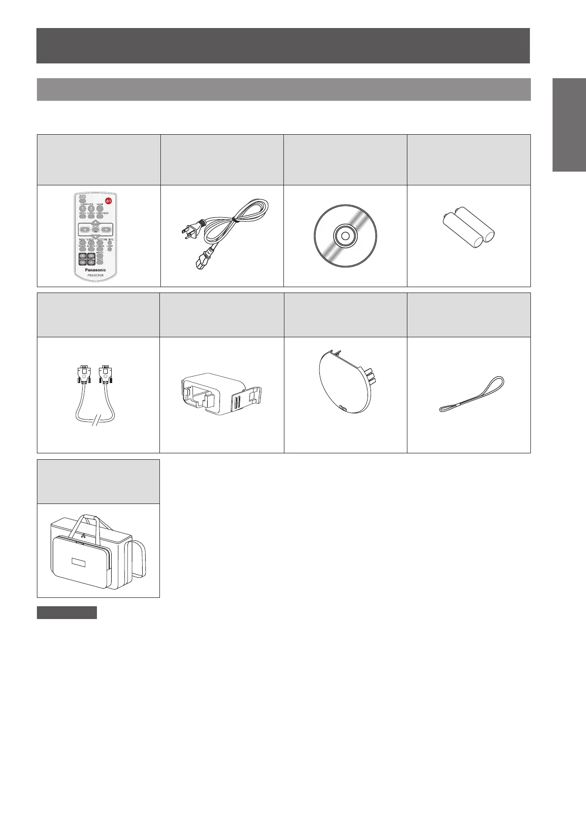 Make sure the following accessories are provided with your projector. Numbers in the brackets ( ) show the