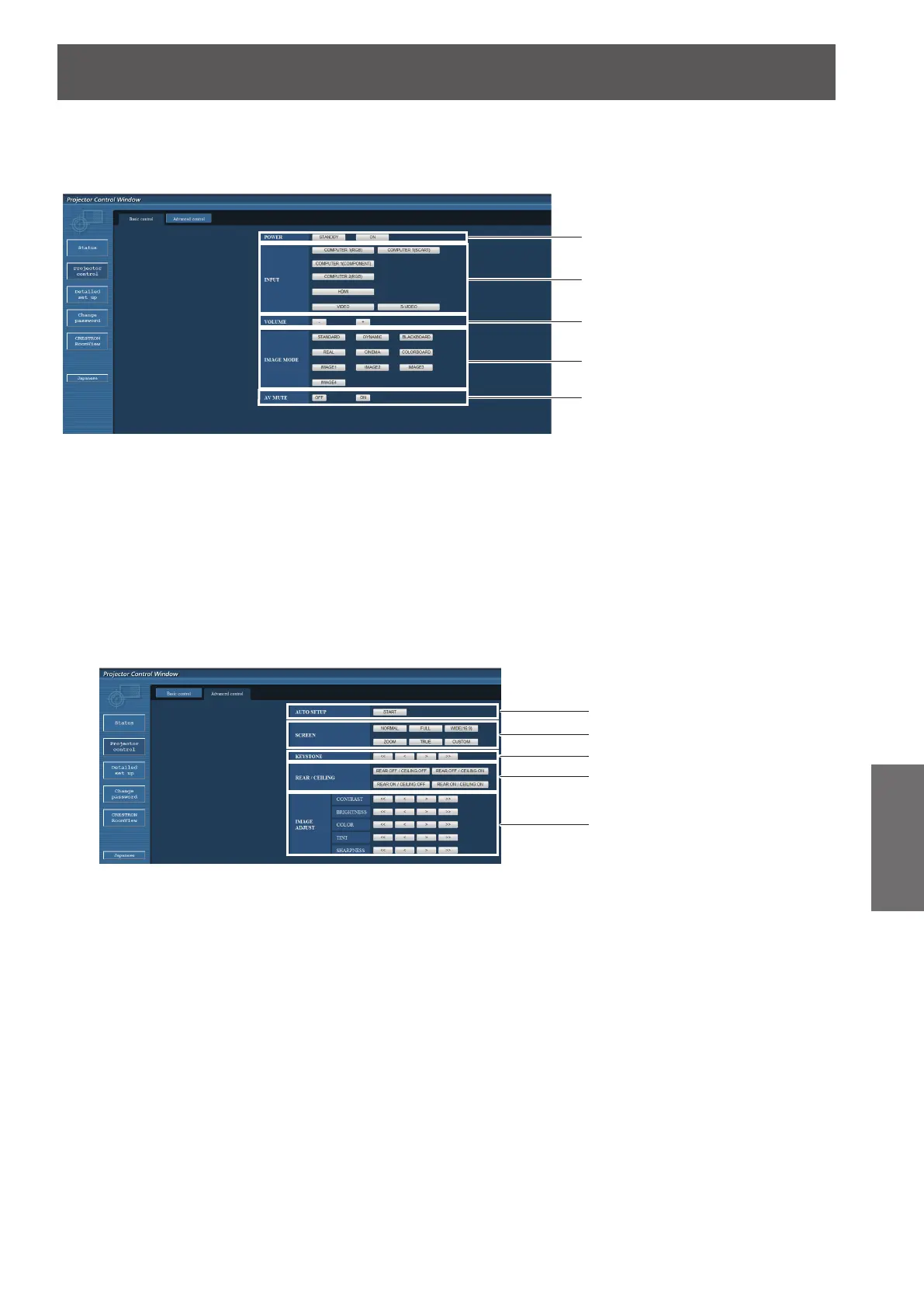 Click [Projector control], then [Advanced control] to display the Detail control page.