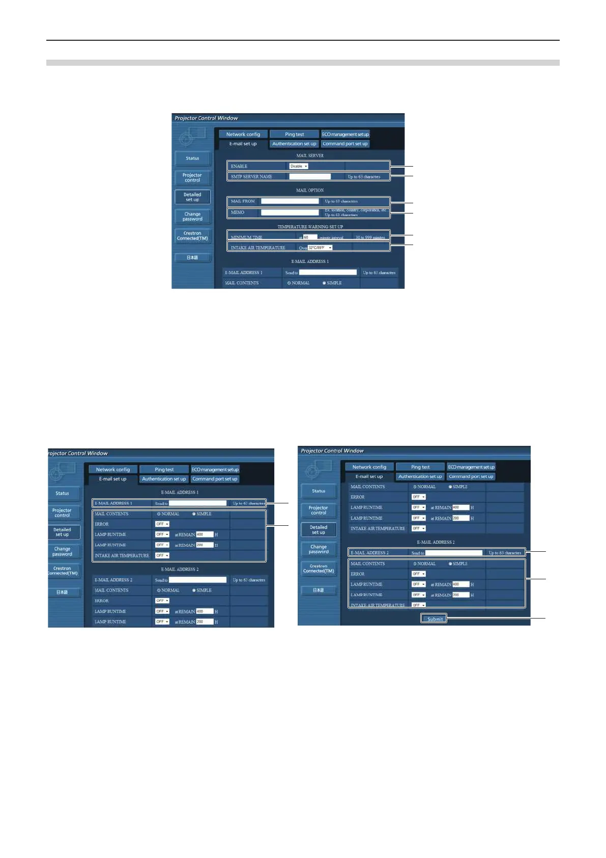 When there is a problem or the runtime of a lamp reaches a set value, an E-mail can be sent to preset E-mail addresses (up to