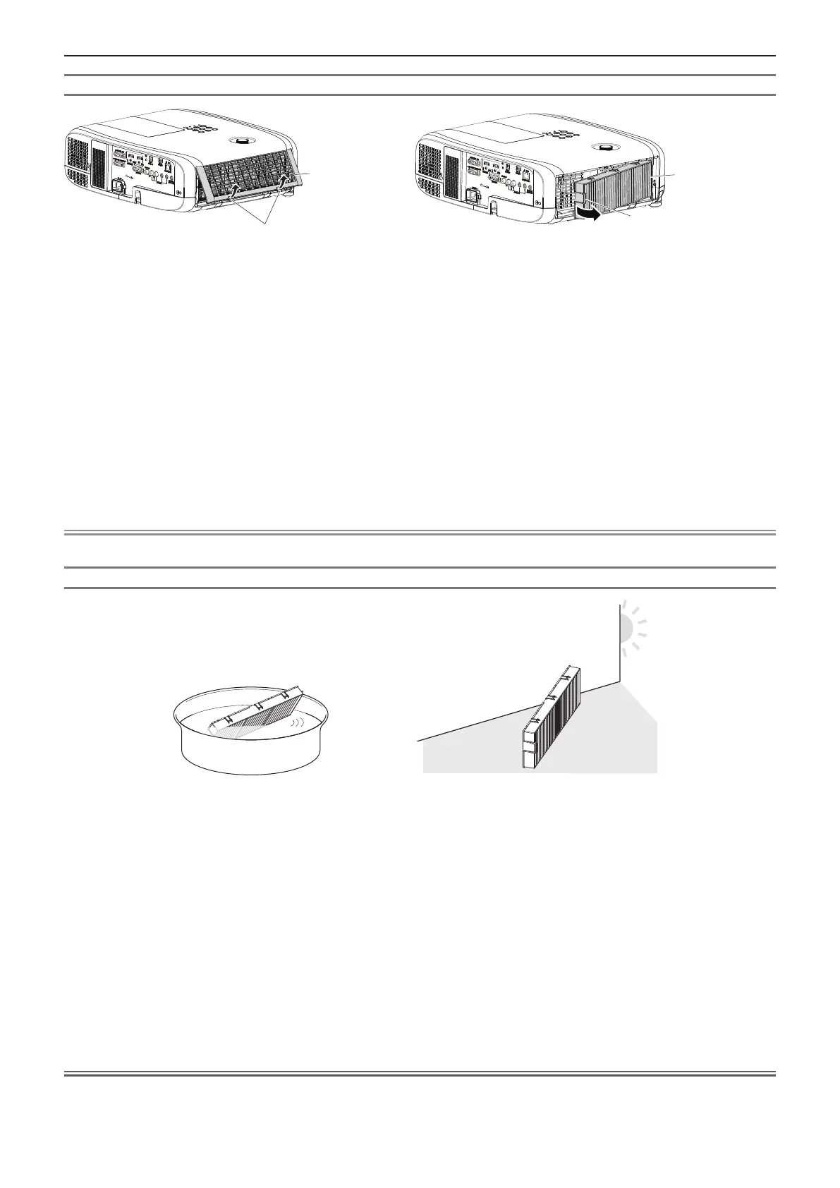 f After washing the air lter unit, dry it thoroughly before attaching it back to the projector. Attaching a wet unit will cause an electric shock or