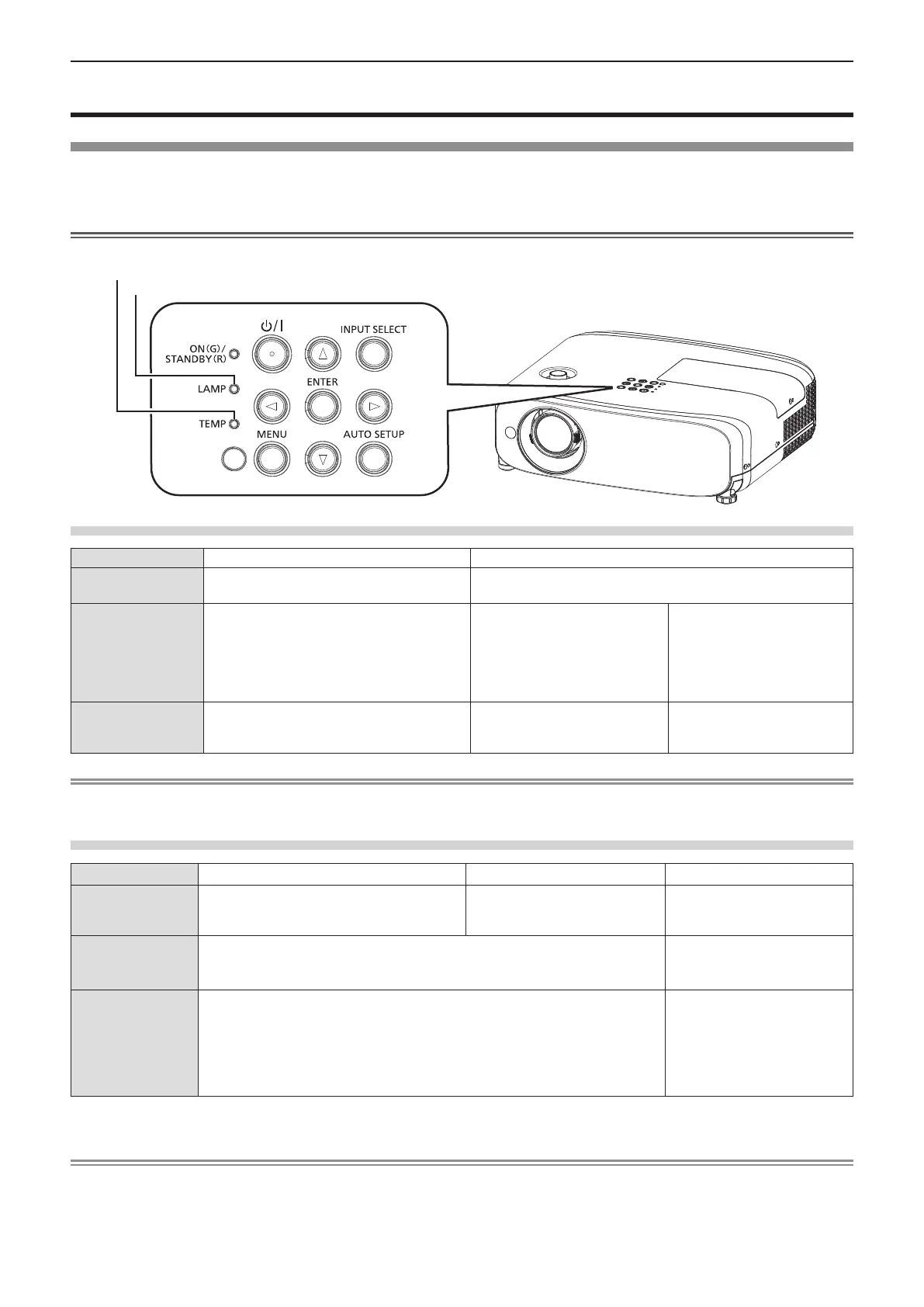 f The lamp indicator <LAMP> lights in green while the projector is in projection mode if there is no notication by lighting or blinking in red.
