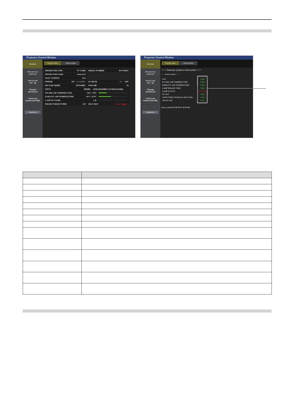 When [Error (Detail)] or [Warning (Detail)] is displayed in the [SELF TEST] display eld of the [Projector status]
