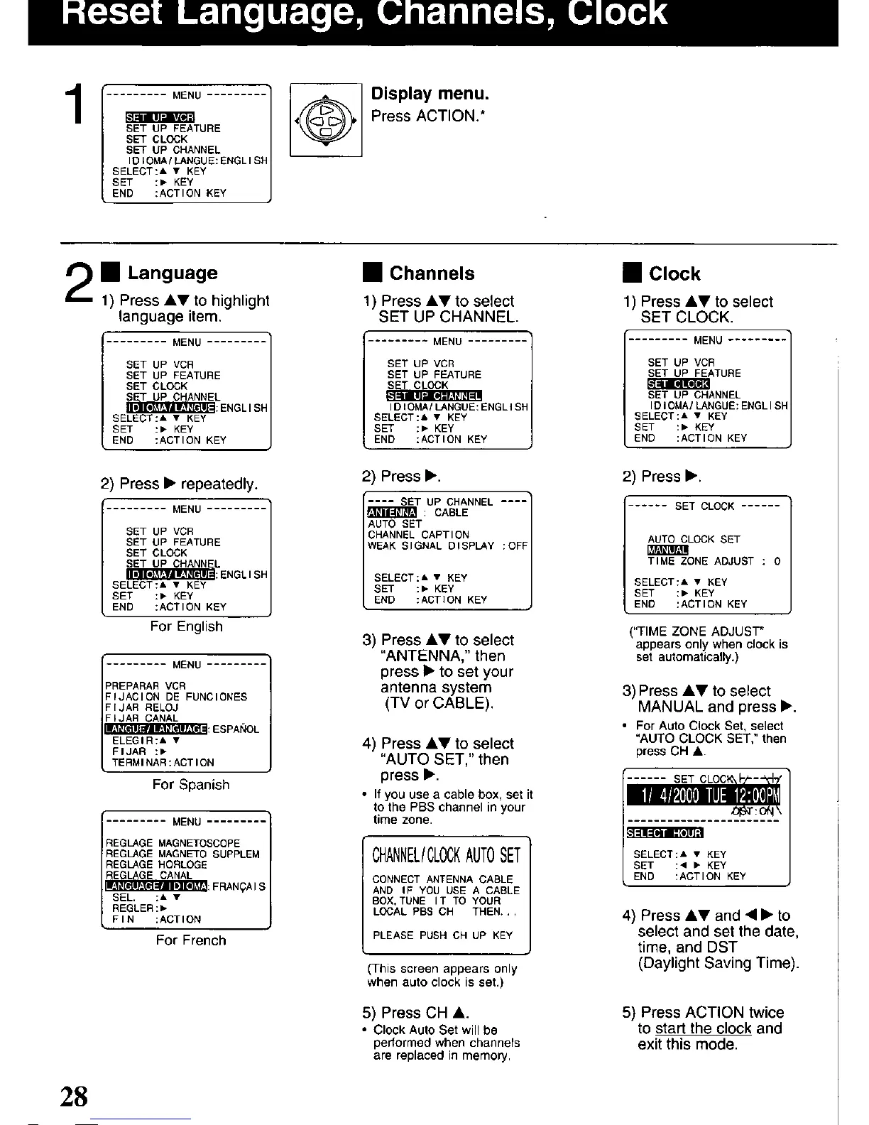 Panasonic PV-9455S - System Settings Reset; Language, Channel, and Clock Setup