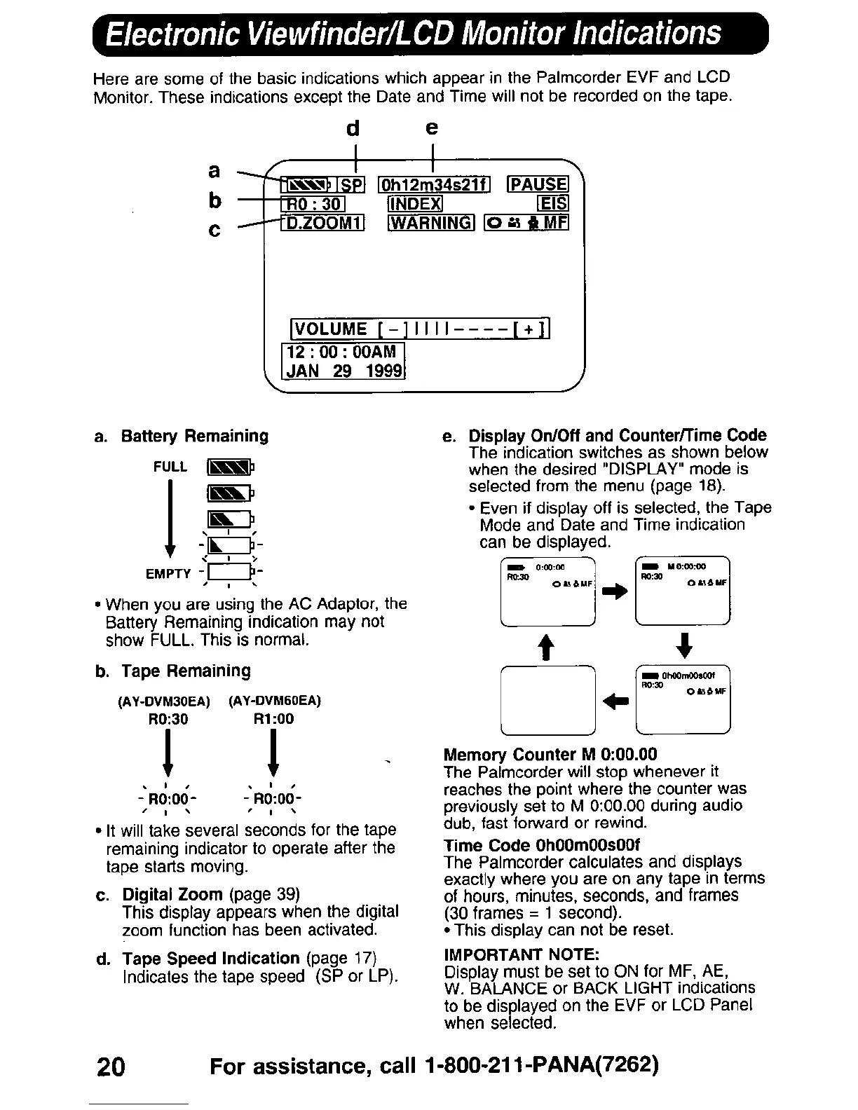 Panasonic PV-DV900 - Monitor and Indicator Information; Electronic Viewfinder;LCD Monitor Indications