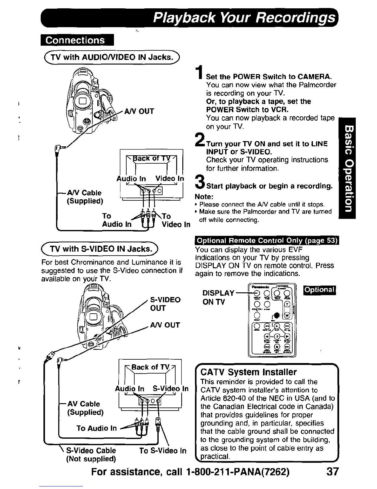 Panasonic PV-DV900 - Connections; Optional Remote Control Only; TV with S-Video in Jacks; CATV System Installer