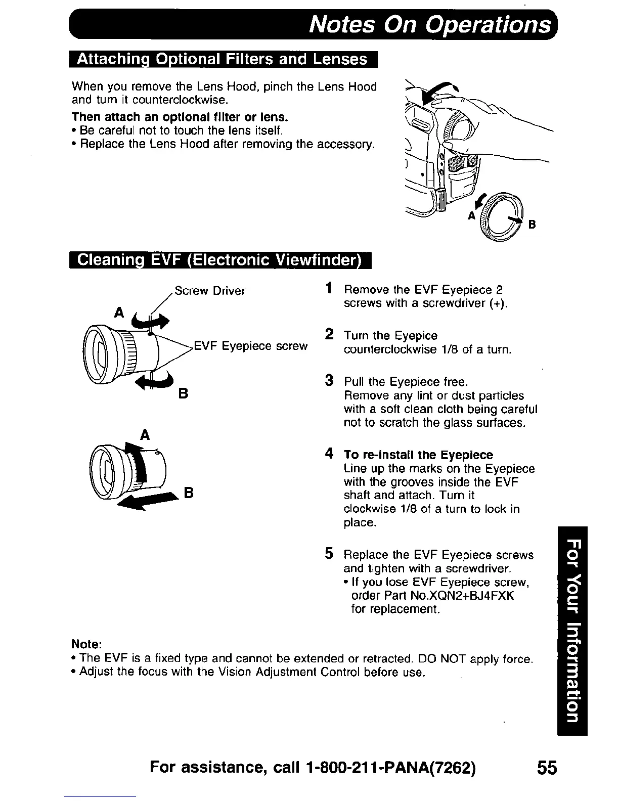 Panasonic PV-DV900 - Operational Notes and Troubleshooting; Attaching Optional Filters and Lenses; Cleaning the Electronic Viewfinder (EVF)
