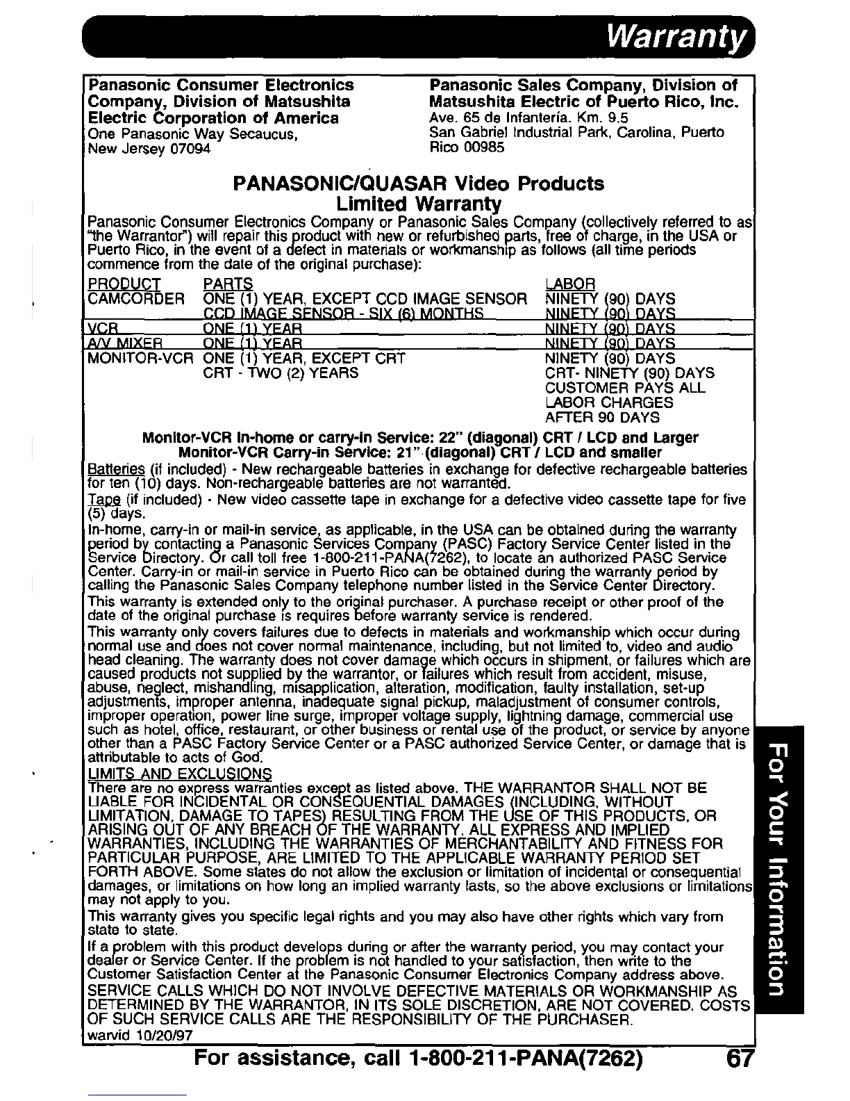 Panasonic PV-DV900 - Warranty Information; Limited Warranty Details
