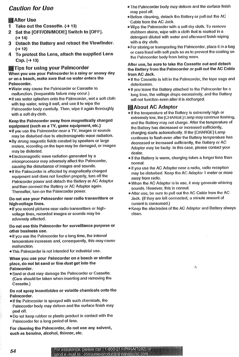 Panasonic PV-DV901 - Cautions for Palmcorder Use and Maintenance; Environmental and Electrical Precautions