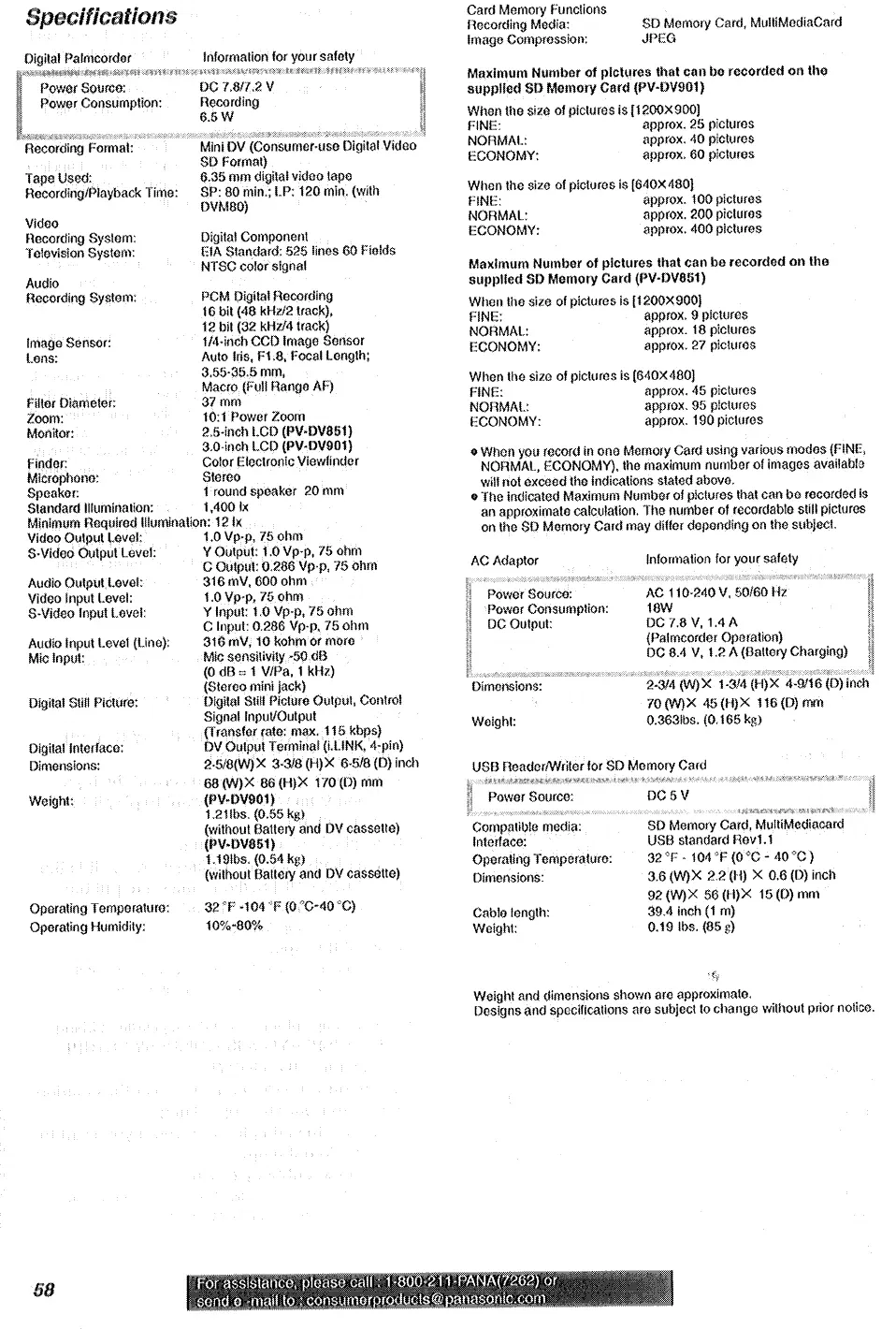Panasonic PV-DV901 - Technical Specifications; Camcorder Specifications; Card Memory Specifications; AC Adaptor and USB Reader Specifications