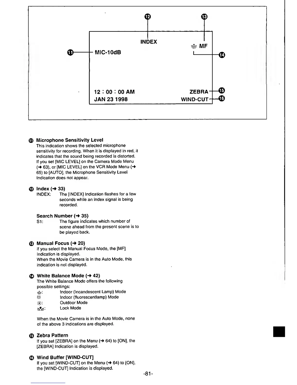 Panasonic PV-DV950 - On-Screen Indications (Part 4); Microphone Sensitivity and Index; Focus, White Balance, and Pattern Modes