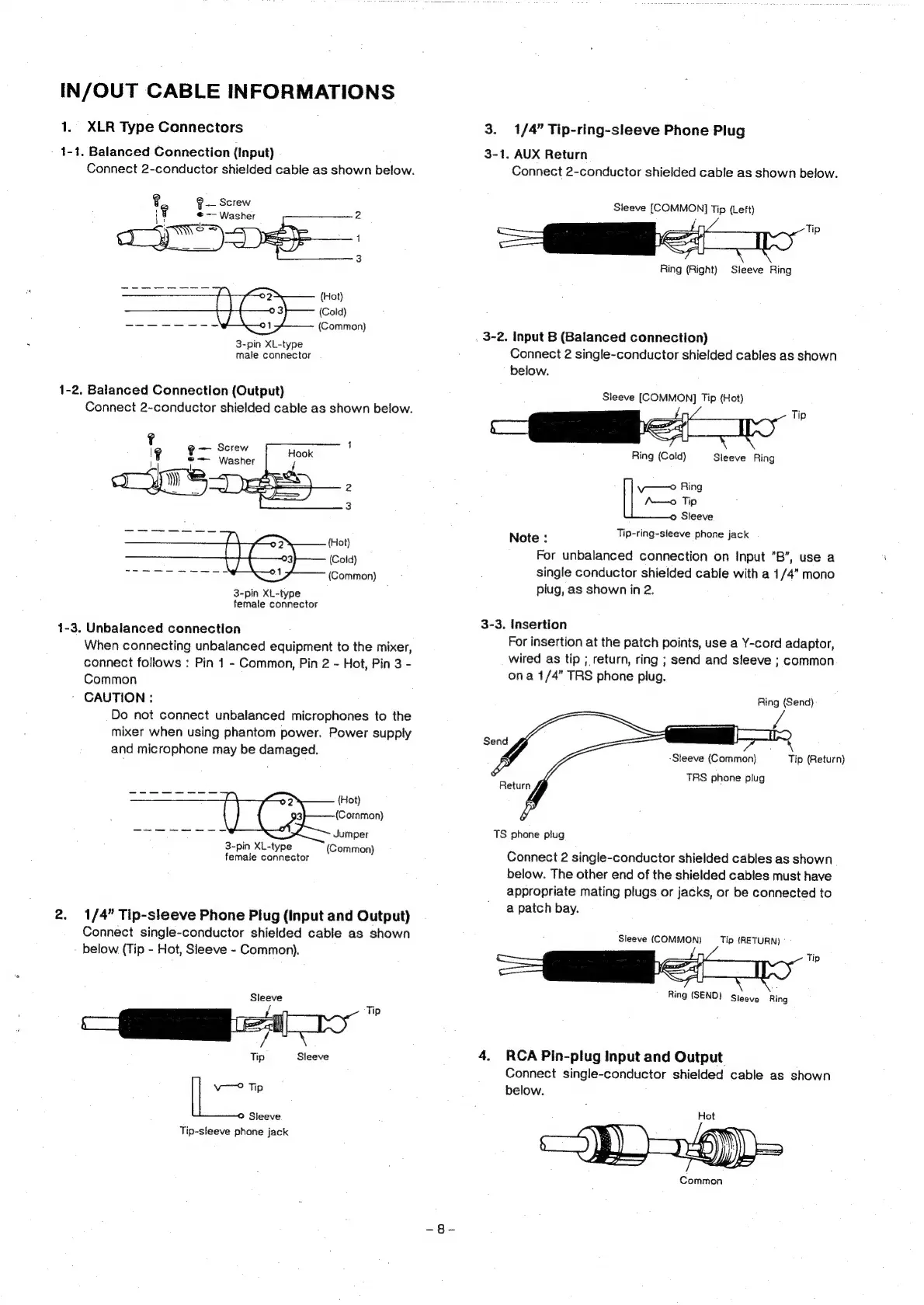 Panasonic Ramsa WR-S4424 - XLR Cable Connections; 1;4 Phone Cable Connections; Insertion and RCA Cable Connections