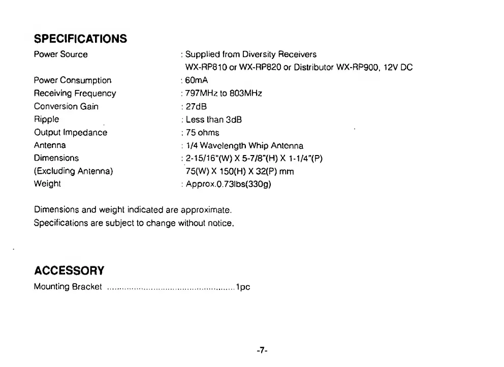 Panasonic RAMSA - Specifications; Accessory