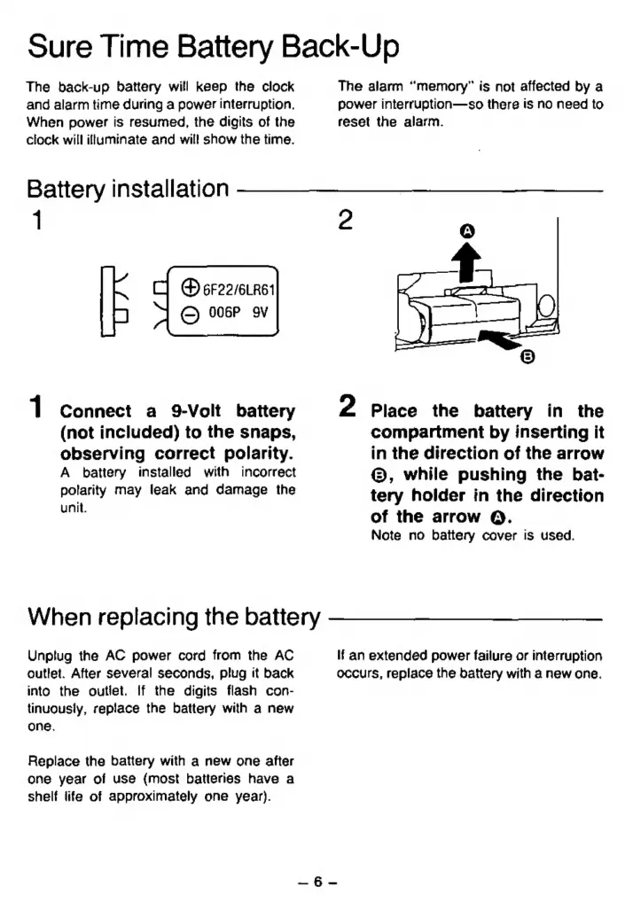 Panasonic RC-6099 - Sure Time Battery Back-Up; Battery Installation Procedure; Battery Replacement Guide