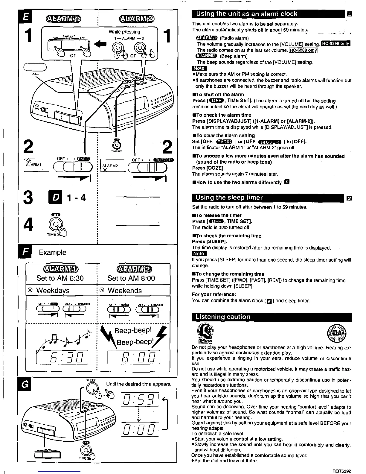 Panasonic RC-6288 - Alarm and Sleep Timer Functions; Setting and Using Alarms; Using the Sleep Timer; Listening Caution