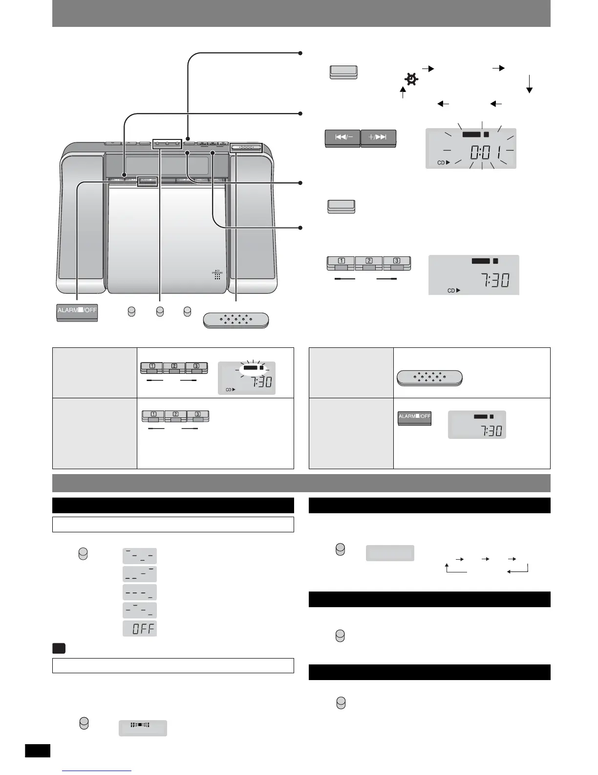 Förberedelse: Ställ in klockan. För ALARM 1 spelar du av CD-spåret eller radiostationen och ställer in den volym som du vill vakna till.