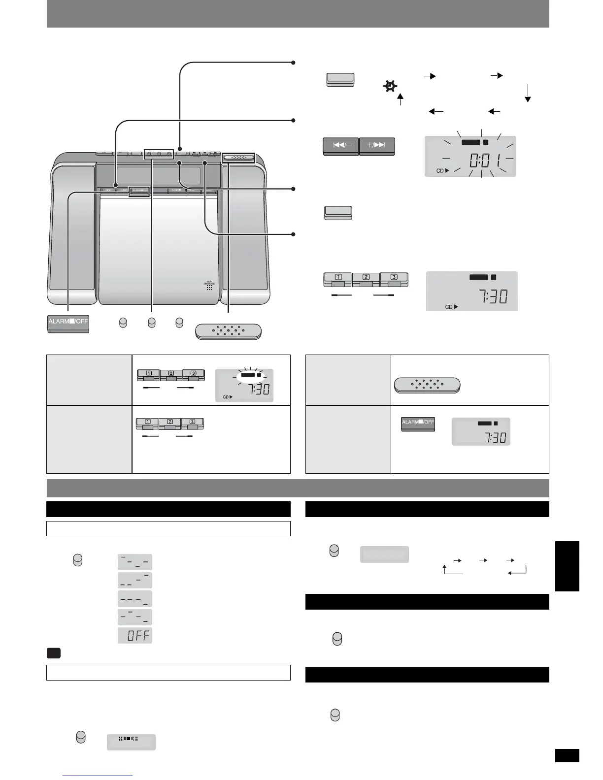Příprava: Nastavte čas. K nastavení možnosti ALARM 1 spust’te přehrávání skladby CD nebo rádiové stanice a nastavte přístroj na hlasitost, kterou si