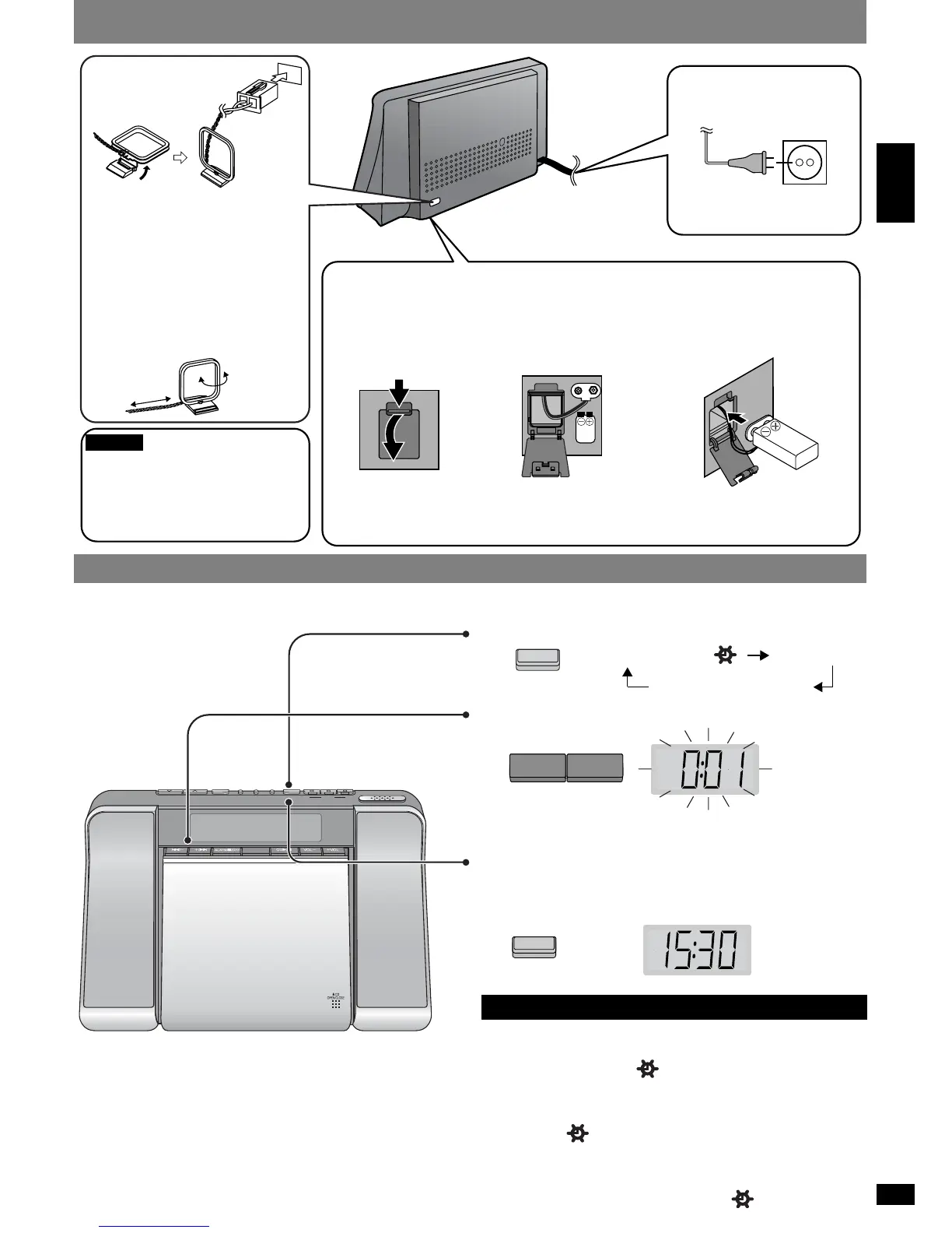 Die eingebaute Uhr dieses Gerätes arbeitet im 24-Stunden-System. In diesem Beispiel wird gezeigt, wie Sie die Uhr auf 15:30 Uhr einstellen. Stellen Sie