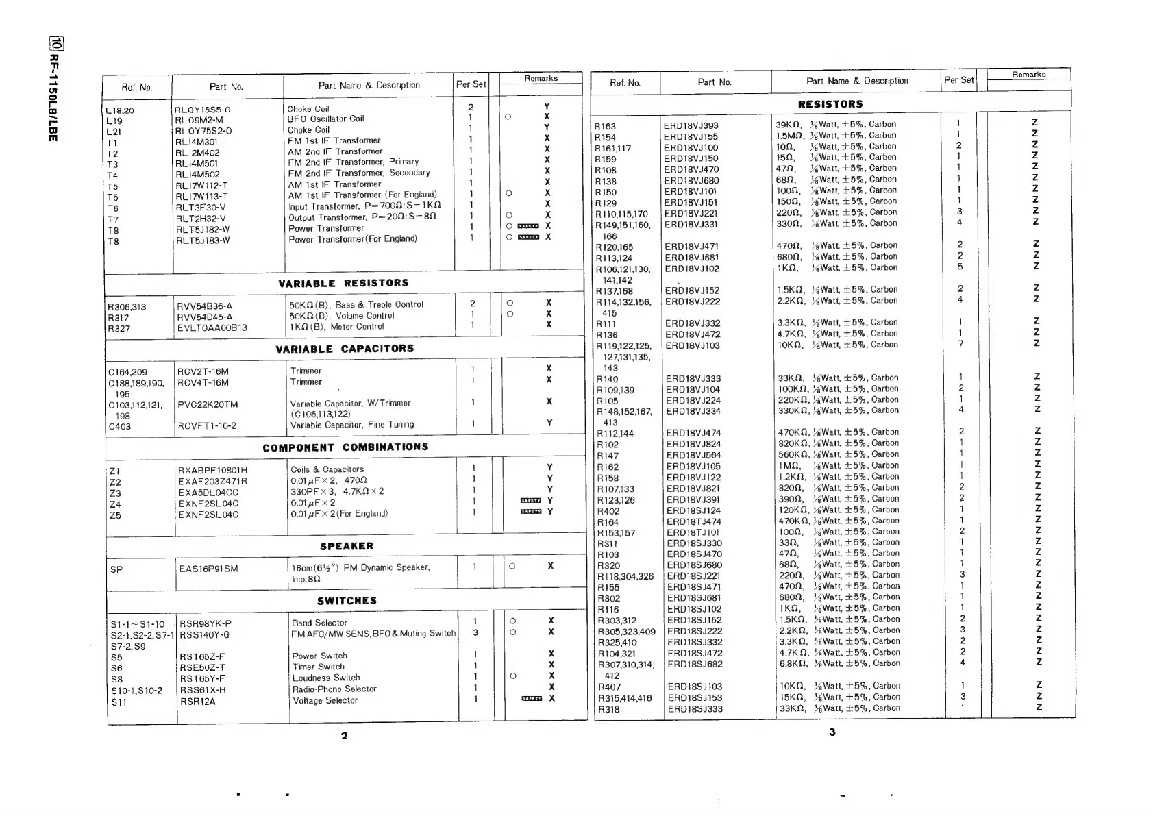 Panasonic RF-1150LB - Replacement Parts List - Resistors & Controls; Choke Coils and Transformers; Variable Resistors; Variable Capacitors
