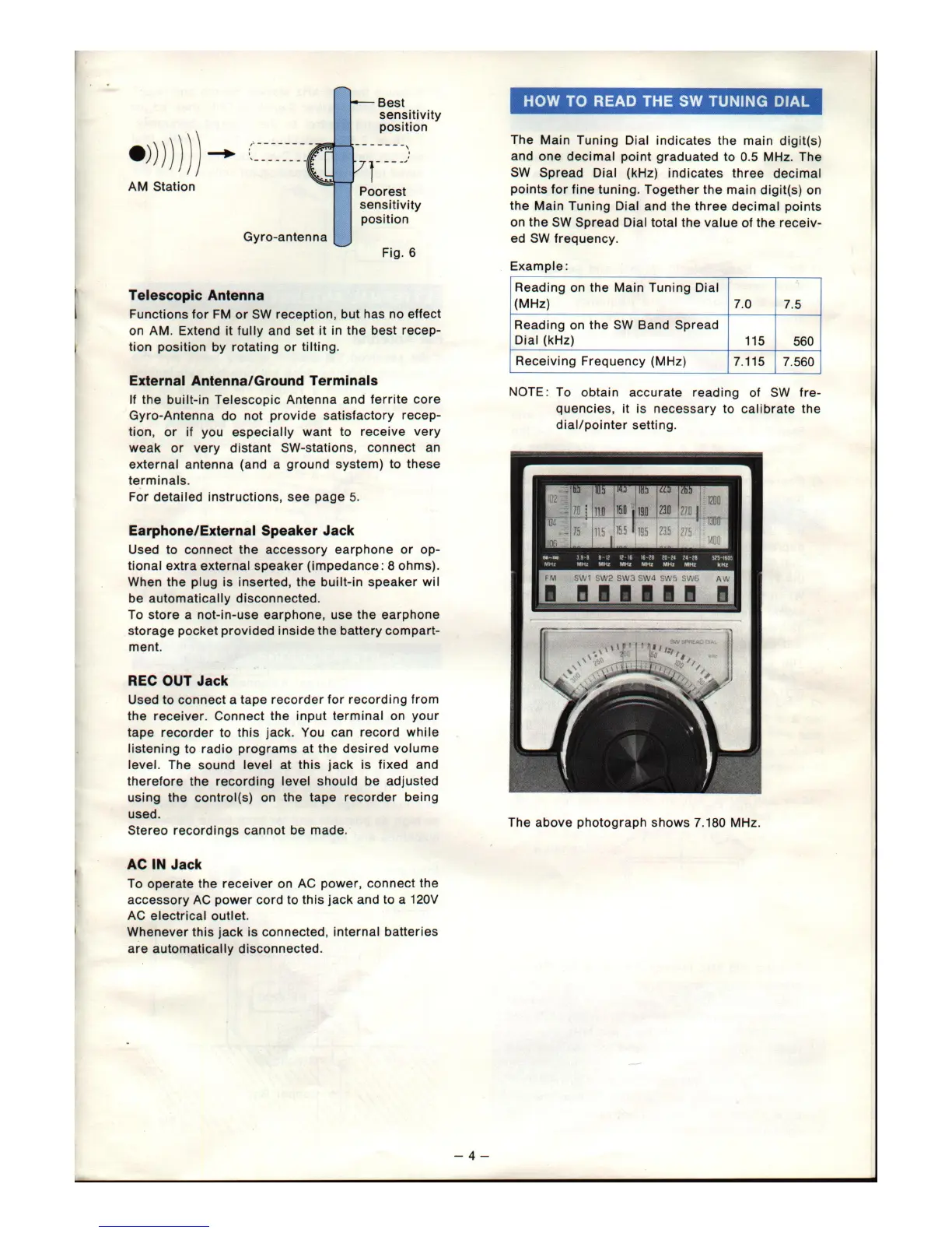 Panasonic RF-2200 - Tuning and Antenna Information; SW Tuning Dial Reading; Antenna Usage; AC Power Input
