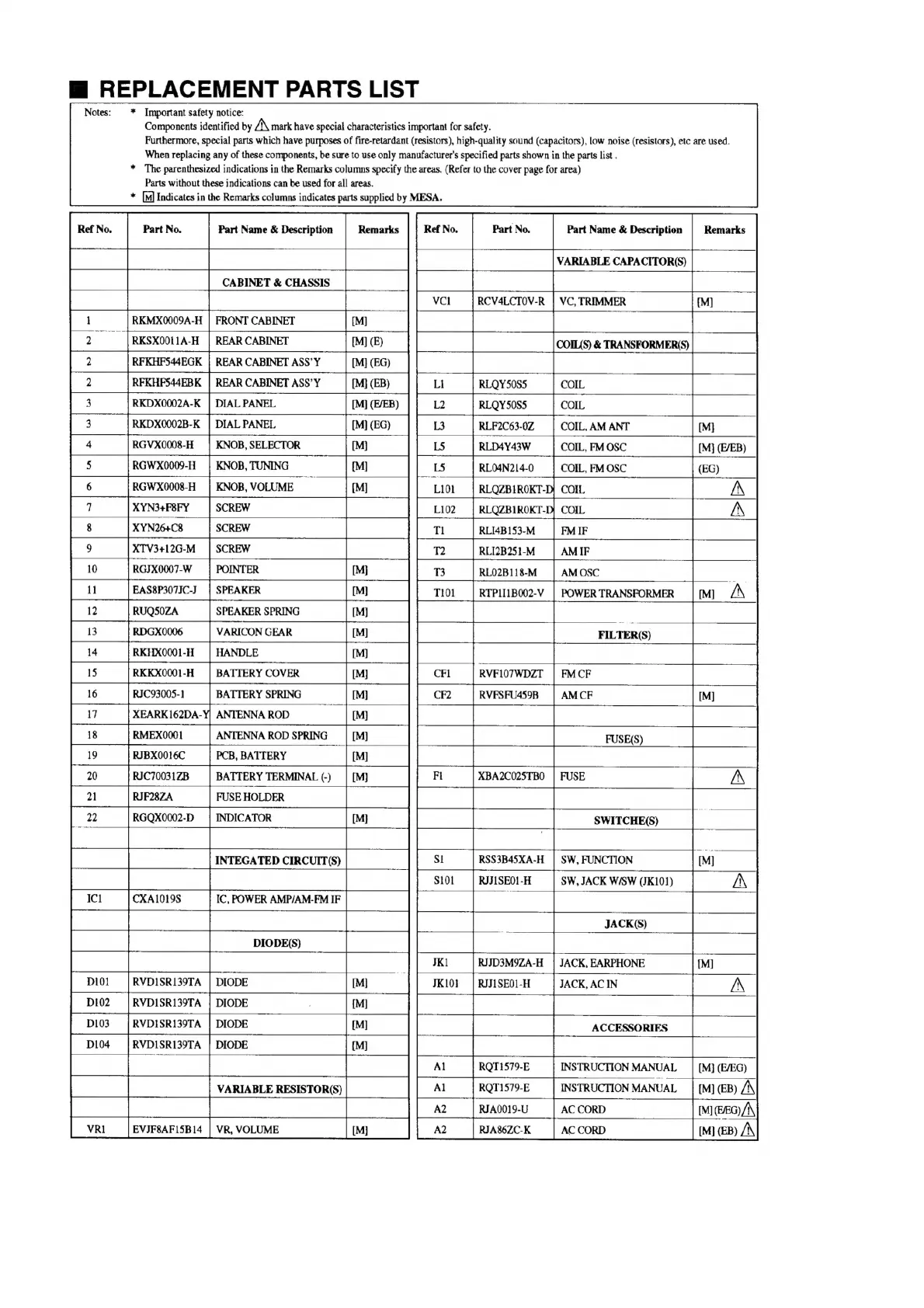 Panasonic RF-544 - Replacement Parts List