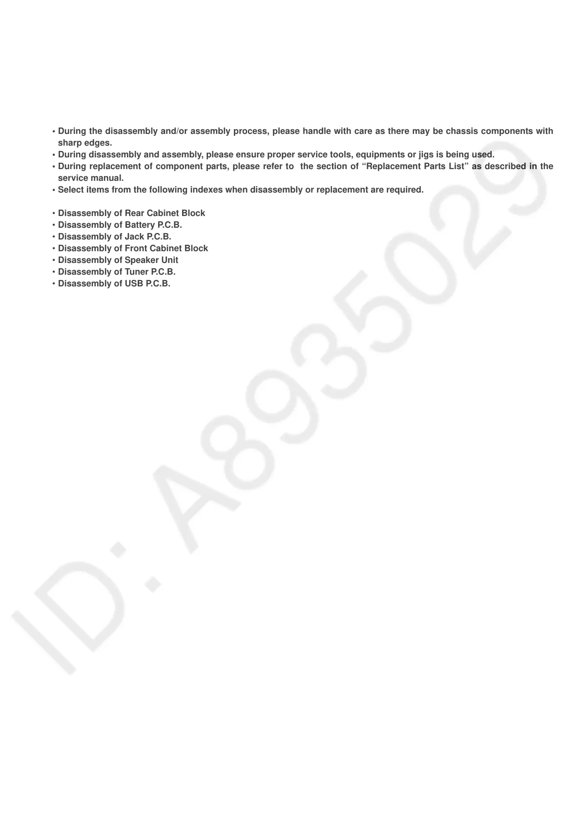 • Before carrying out the disassembly process, please ensure all the safety precautions & procedures are followed.