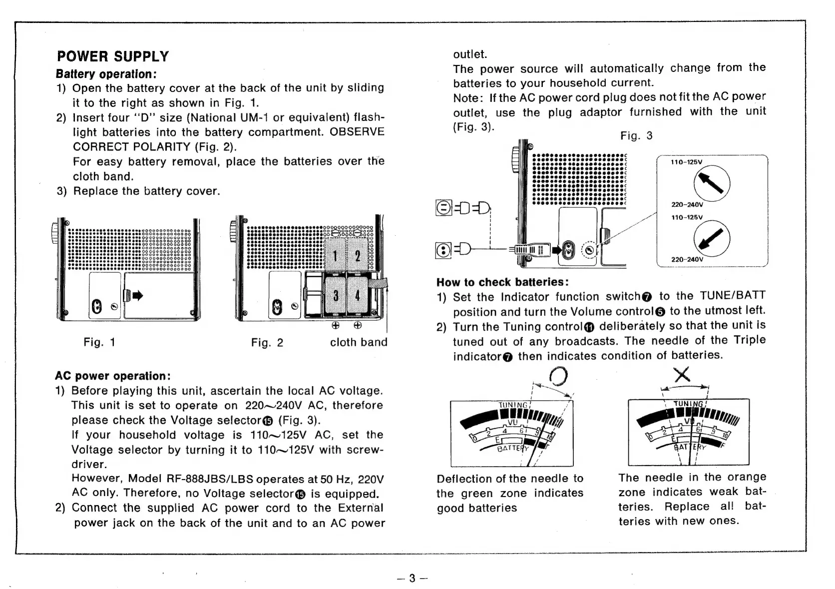 Panasonic RF-888JB - Power Supply; Battery Operation; AC Power Operation; How to Check Batteries