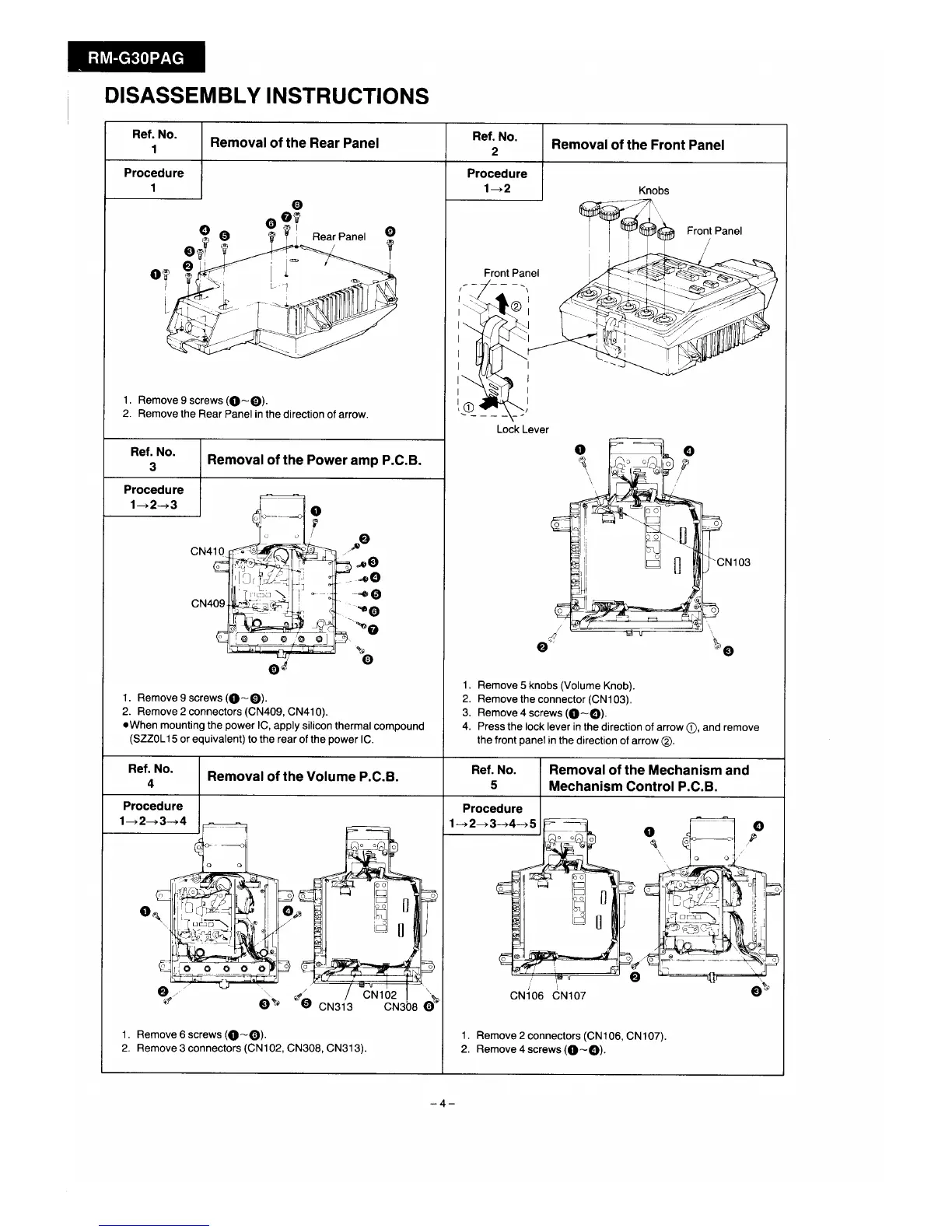 Panasonic RM-G30EAG - Disassembly; Removal of the Rear Panel; Removal of the Power Amp P.C.B.; Removal of the Volume P.C.B.