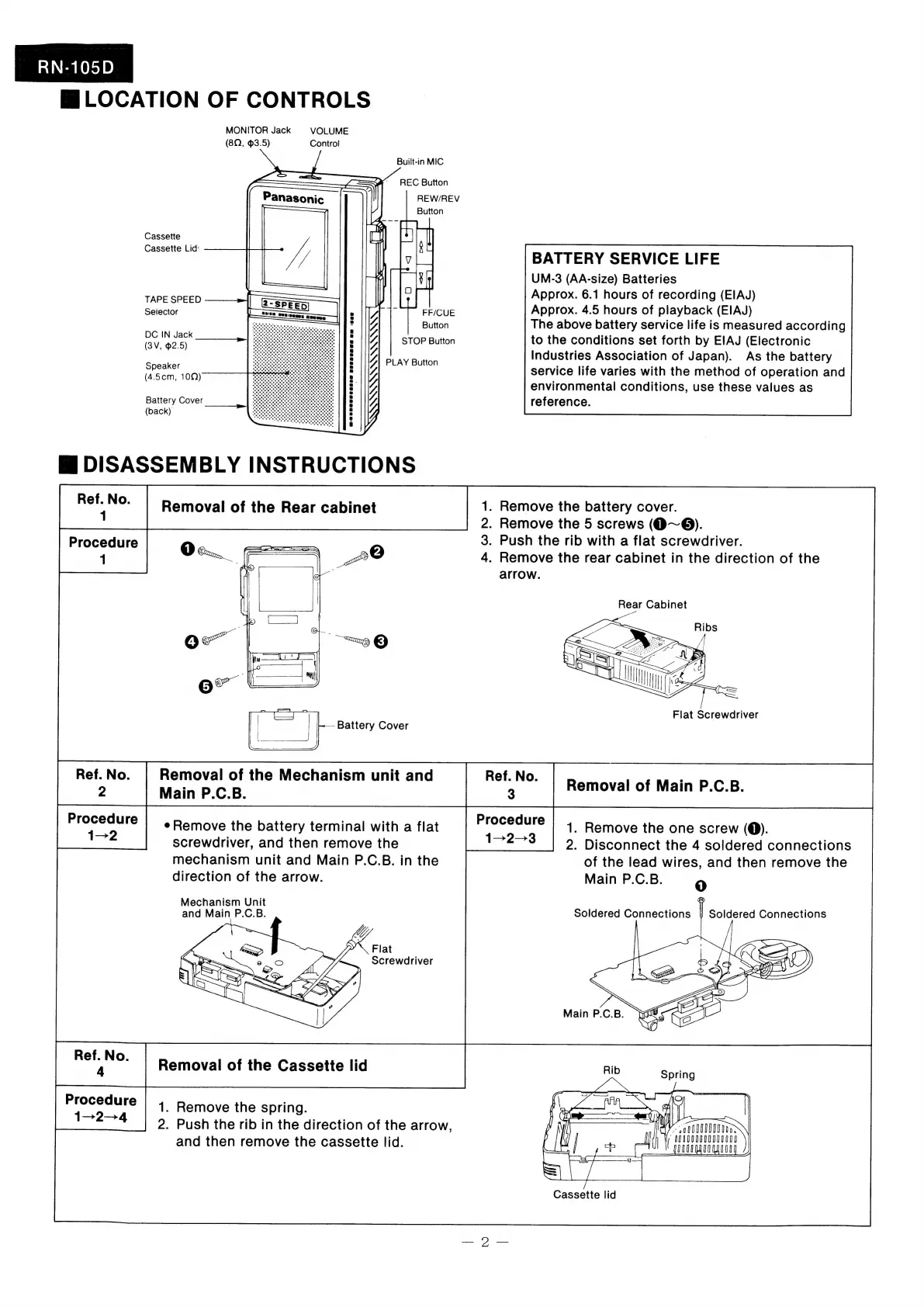 Panasonic RN-105D - Location of Controls; Disassembly Instructions