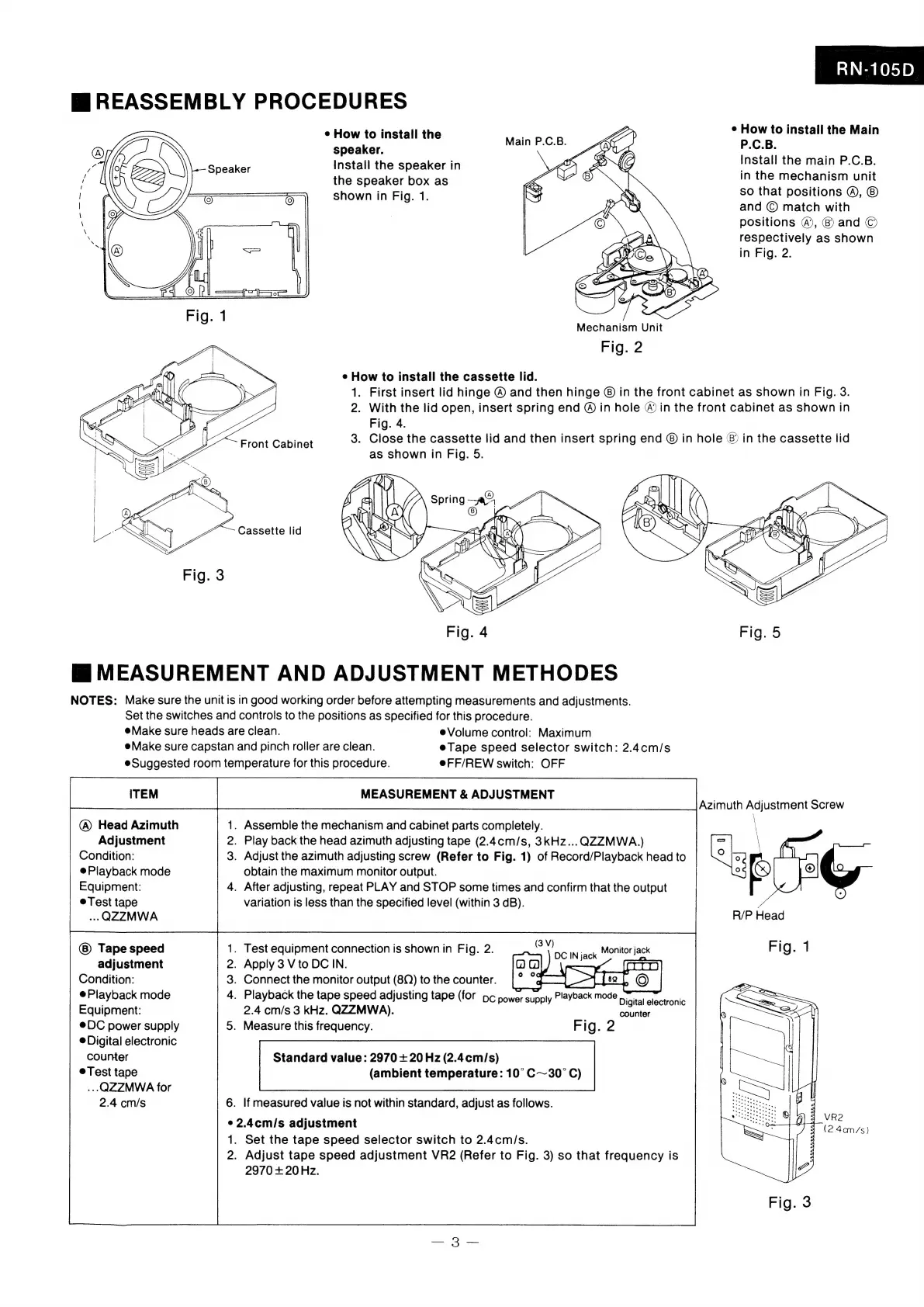 Panasonic RN-105D - Reassembly Procedures; Measurement and Adjustment Methods; Head Azimuth Adjustment; Tape Speed Adjustment