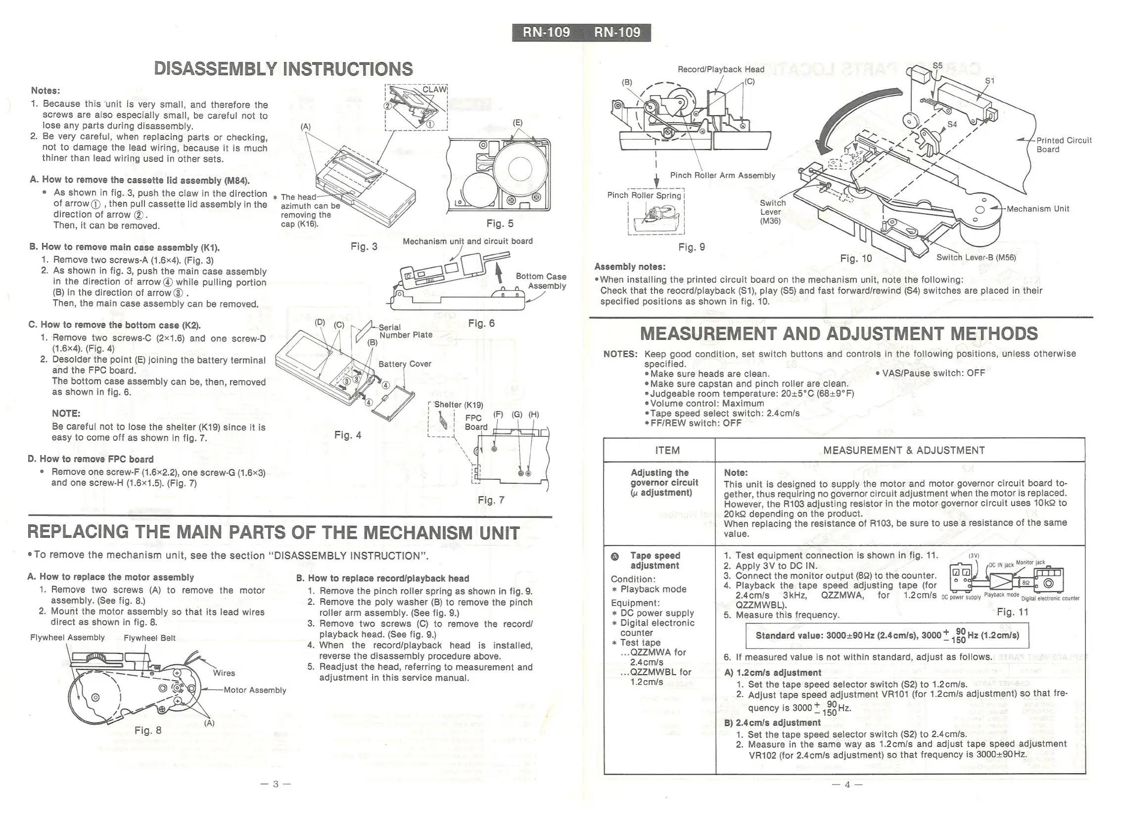 Panasonic RN-109 - Disassembly Instructions; Cassette Lid Assembly Removal; Main Case Assembly Removal; Bottom Case Assembly Removal