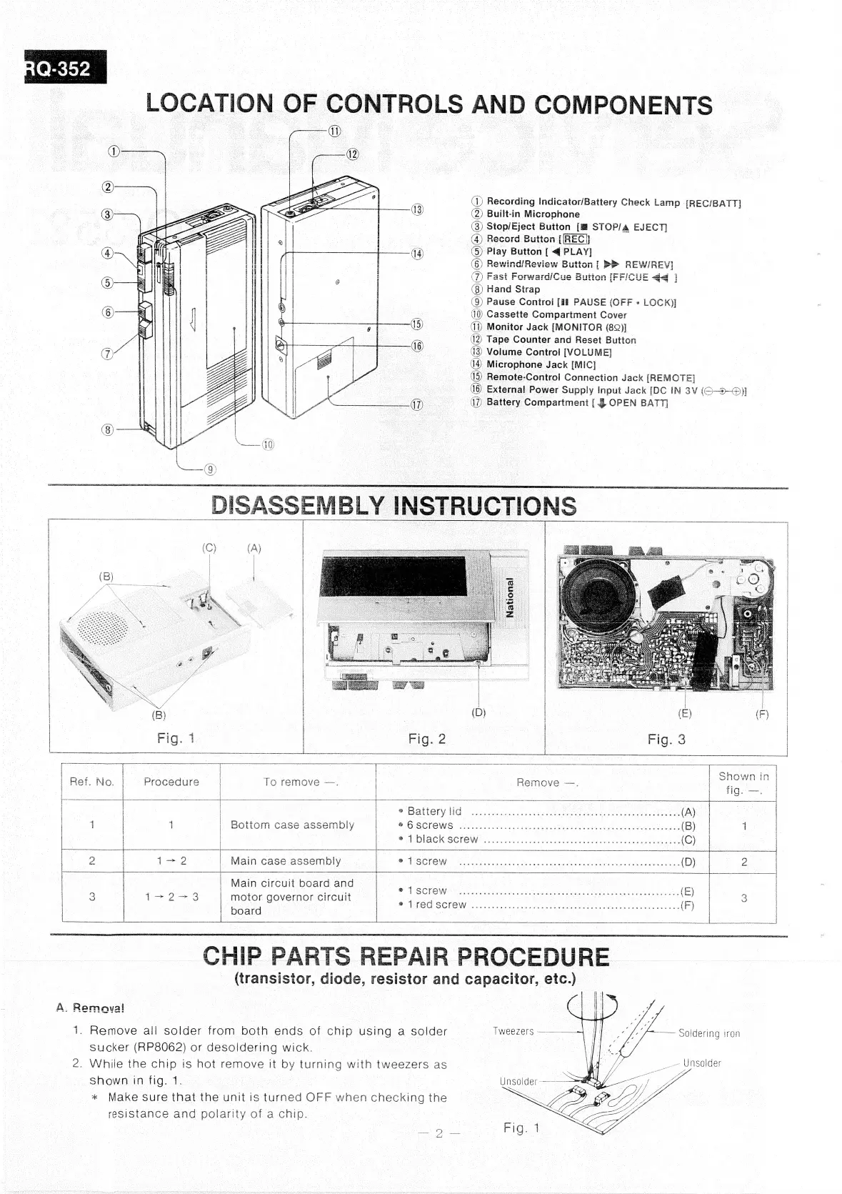 Panasonic RQ-352 - Controls and Components Location; Disassembly Guide; Chip Parts Repair