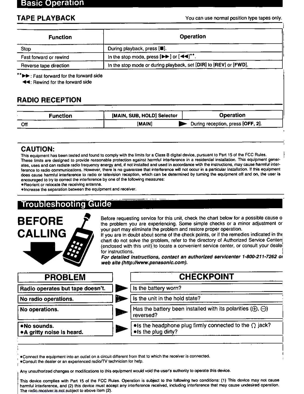 Panasonic RQ-E20V - Basic Operation Details; Tape Playback Functions; Radio Reception Functions; Troubleshooting and Cautions