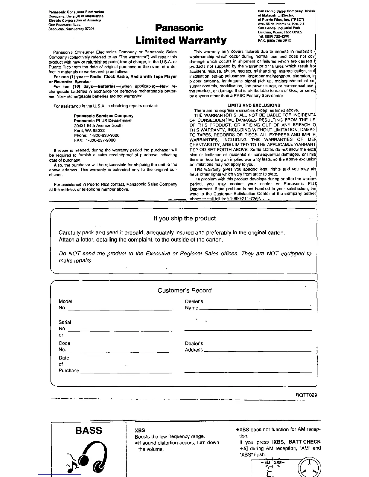 Panasonic RQ-E20V - Warranty and Support; Limited Warranty Details; Customer Service and Shipping