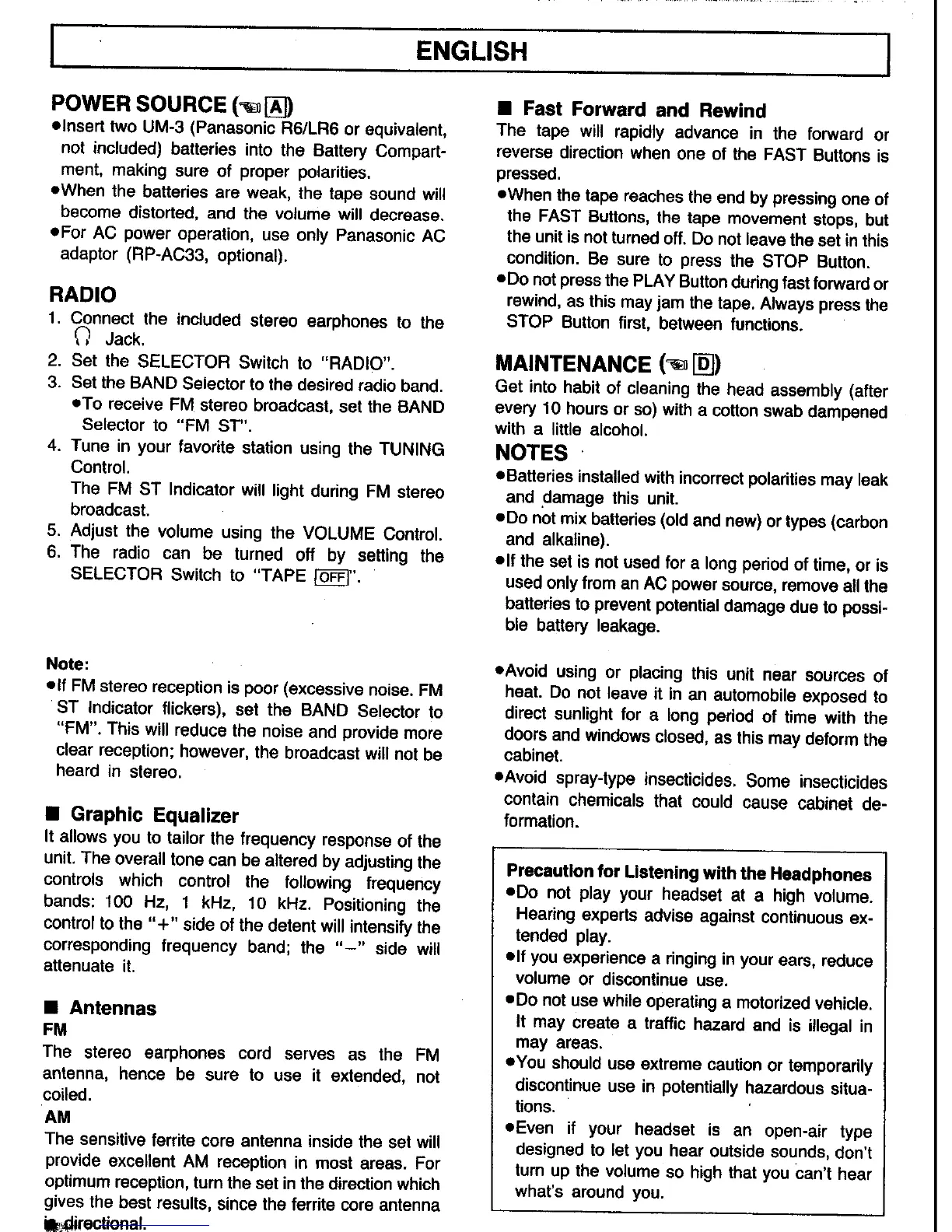 Panasonic RQV152 - Power Source; Radio; Maintenance; Graphic Equalizer