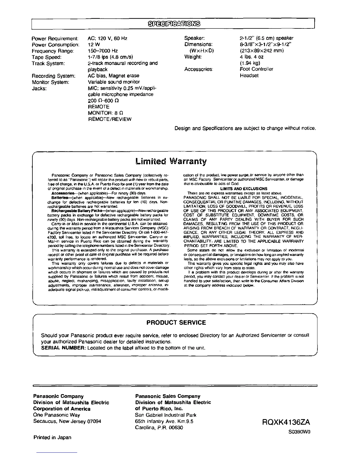 Panasonic RR-830 - Specifications; Limited Warranty; Product Service Information