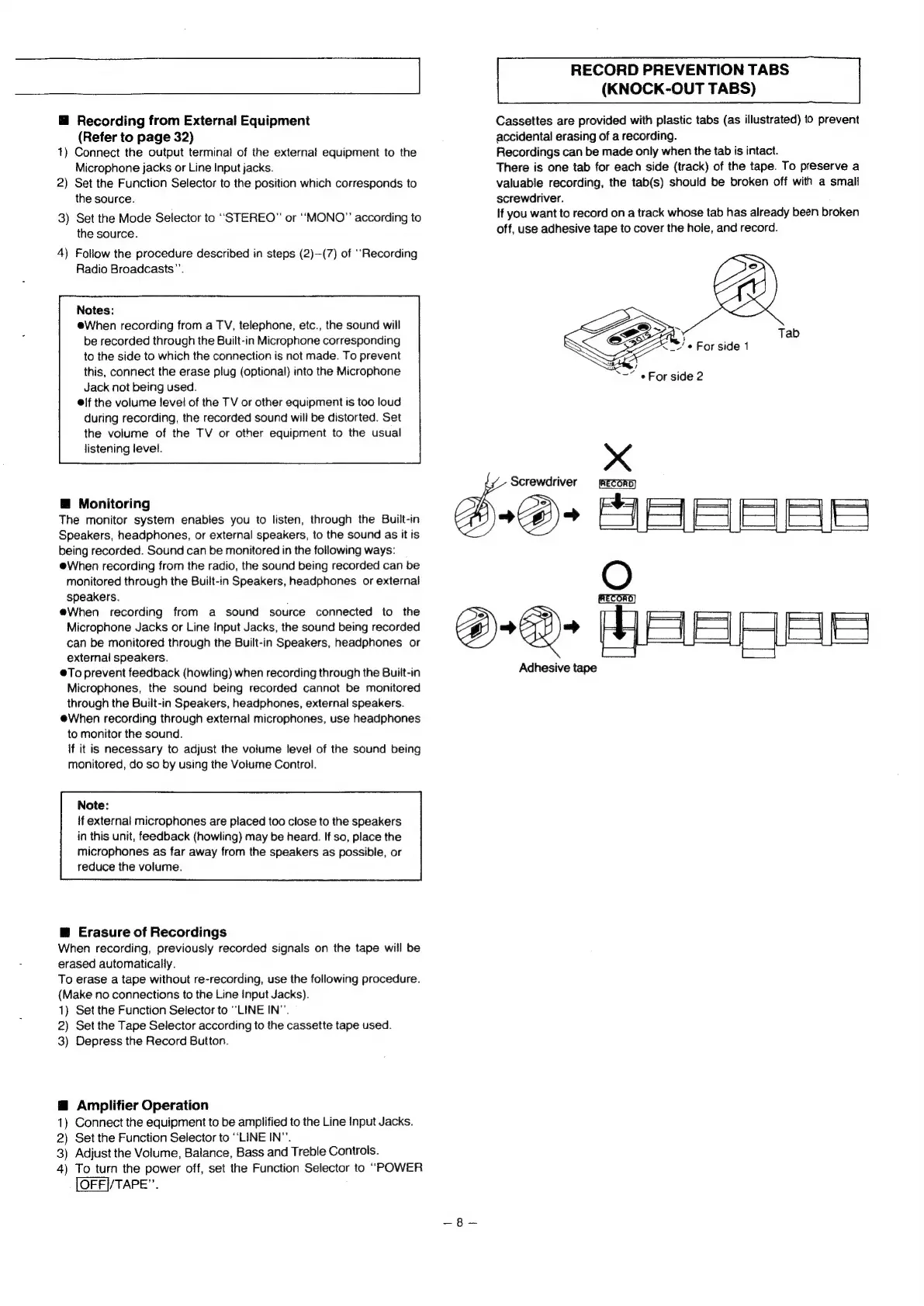 Panasonic RX-5080F - Record Prevention Tabs; Monitoring During Recording; Erasure of Recordings; Amplifier Operation