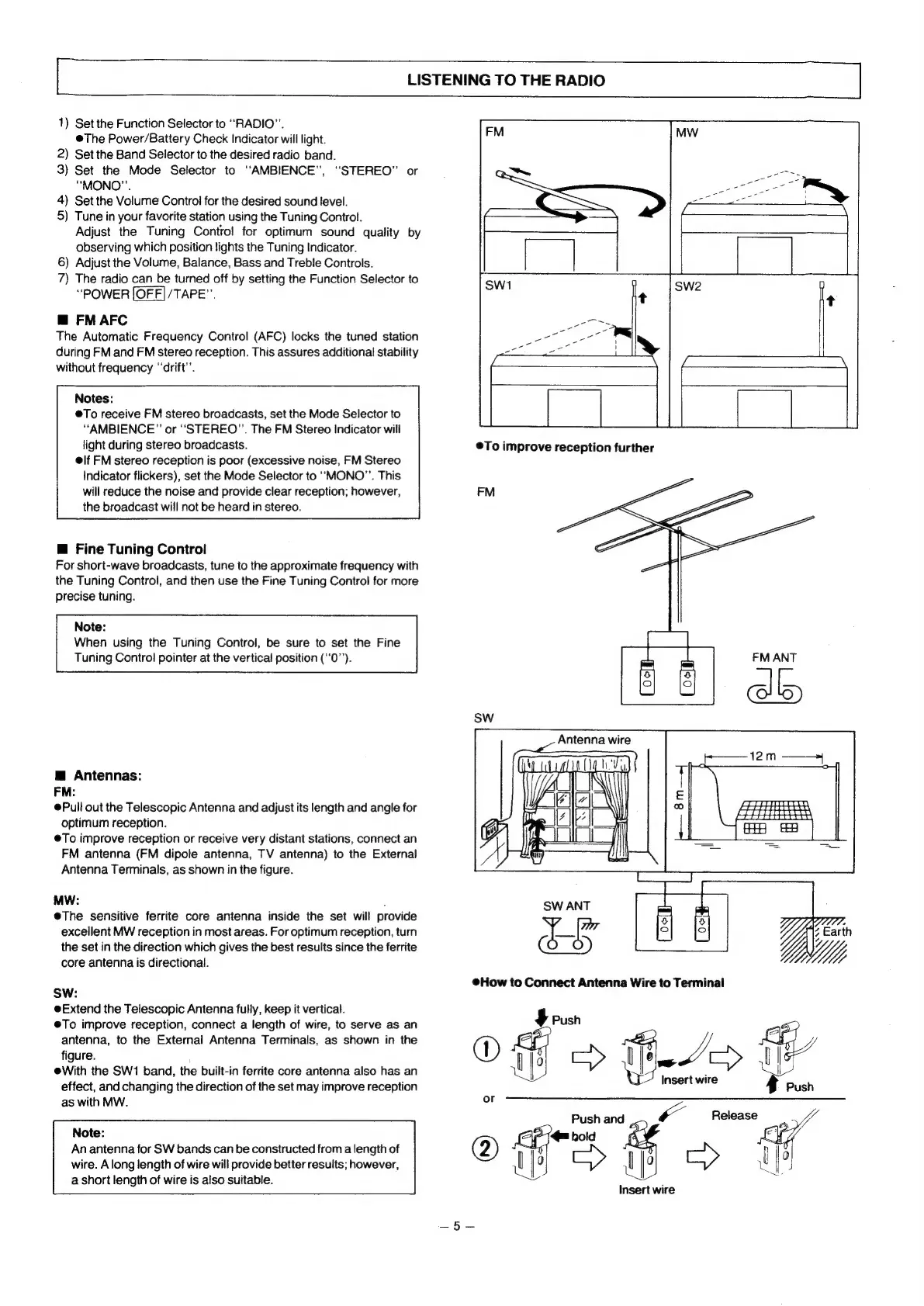 Panasonic RX-5080F - Listening to the Radio; FM AFC; Fine Tuning Control; Antennas