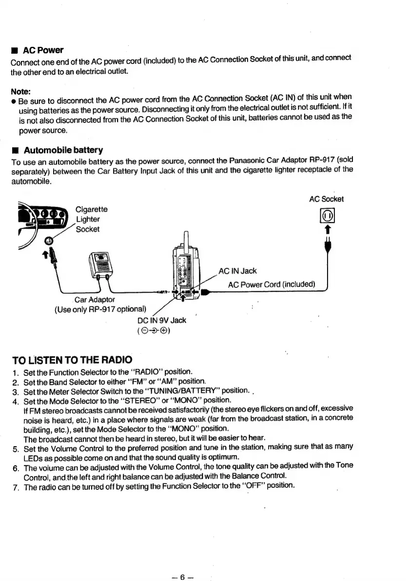 Panasonic RX-5090 - AC Power Connection; Automobile Battery Power
