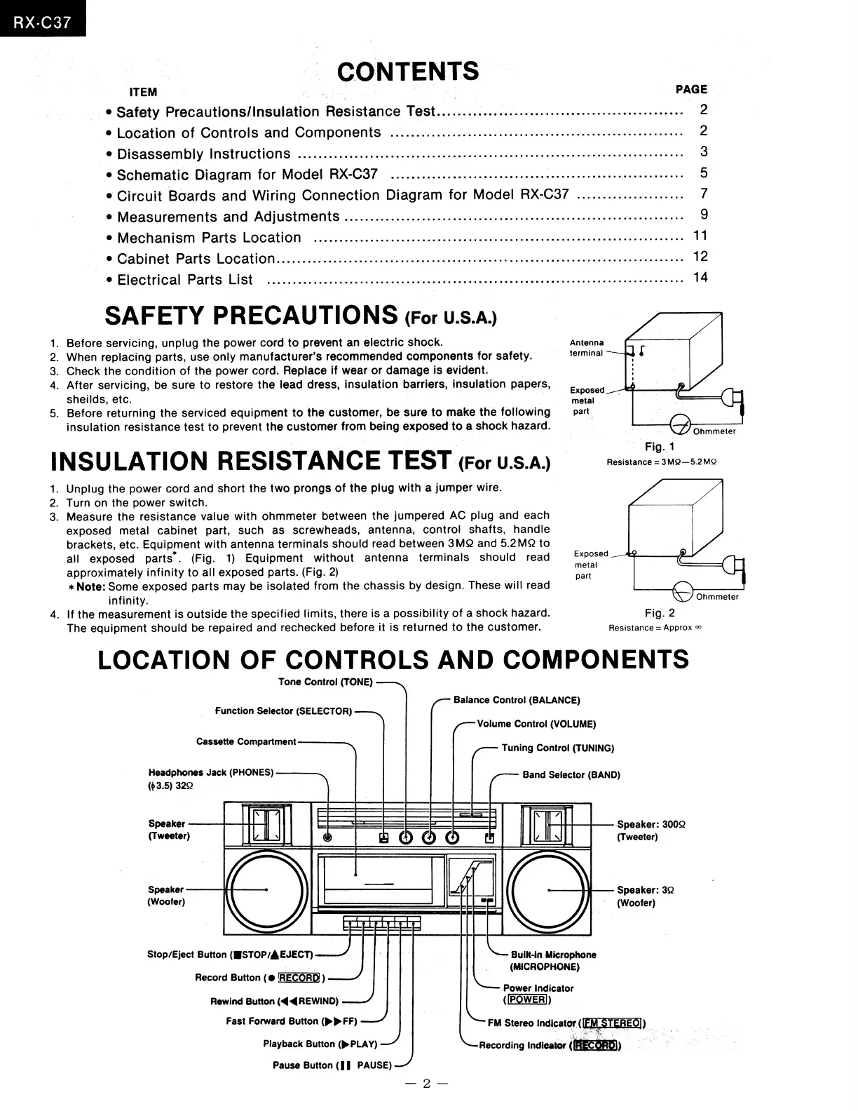 Panasonic RX-C37 - Safety Precautions and Insulation Resistance Test; General Safety Precautions; Insulation Resistance Test Procedure; Location of Controls and Components