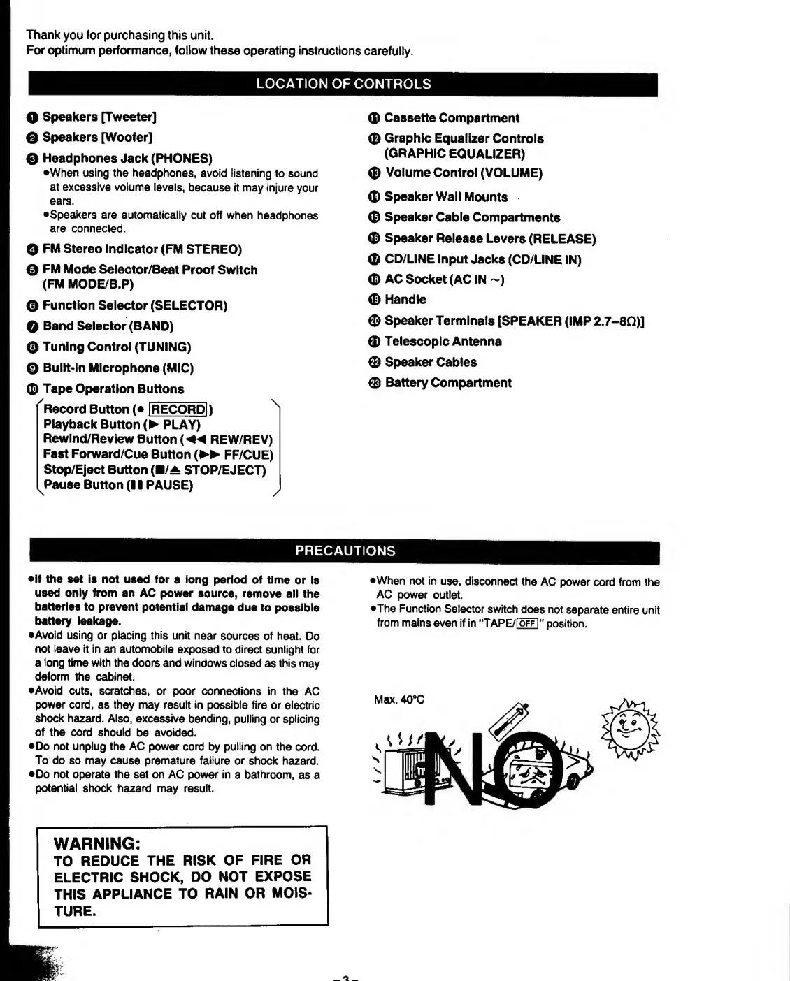 Panasonic RX-CS710 - Location of Controls and Precautions; Speaker System Overview; Unit Operation Controls; Power and Connectivity Features