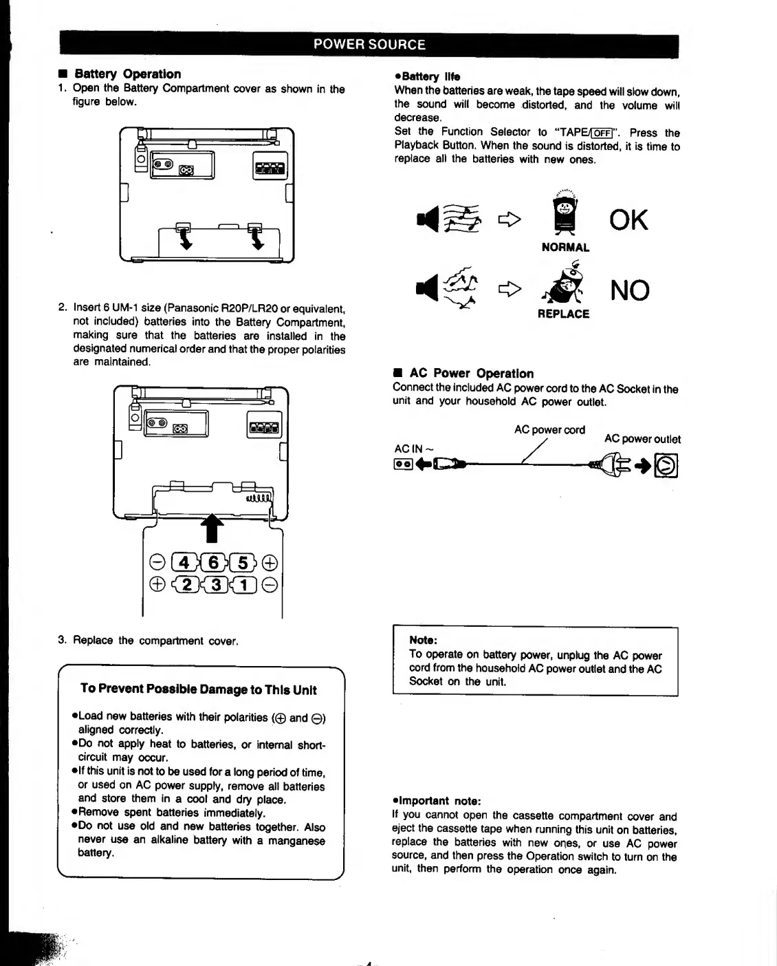 Panasonic RX-CS710 - Power Source Options; Battery Operation; AC Power Operation; Battery Care and Safety