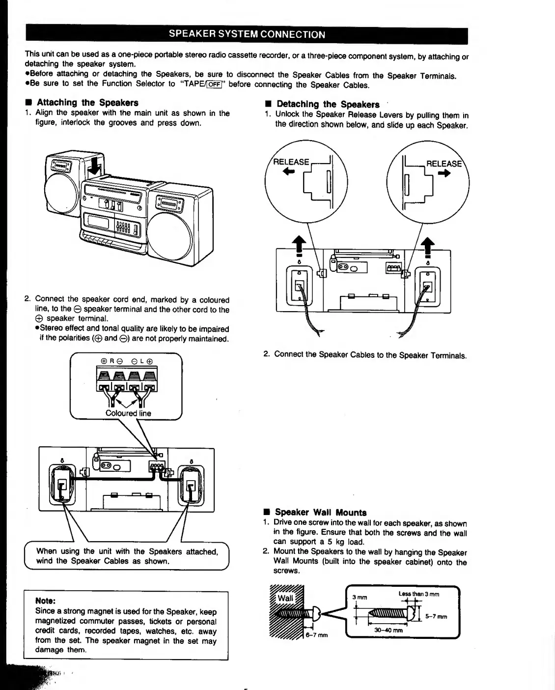 Panasonic RX-CS710 - Speaker System Connection; Attaching and Detaching Speakers; Speaker Wall Mounts